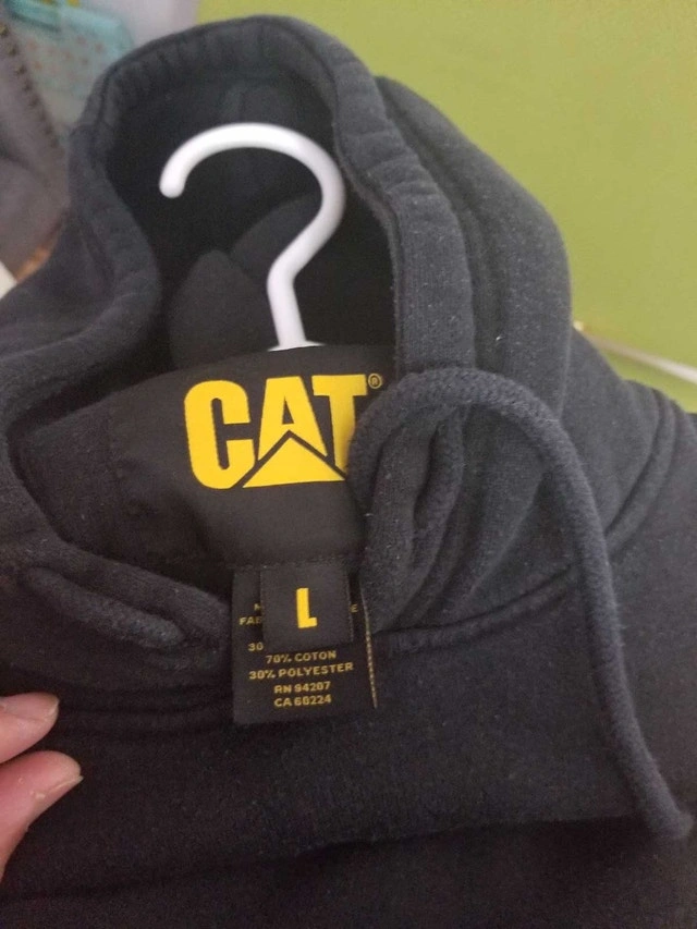 This is a CAT hoodie in size large. It is black with the CAT logo on the front and the word 'CATERPILLAR' down the sleeve. This is a used item. It is in good condition, ready to keep you warm while you work hard or relax. Specifications: Brand: CAT, Size: Large, Colour: Black, Material: 70% Cotton, 30% Polyester. Pre-owned with signs of use but in good condition.