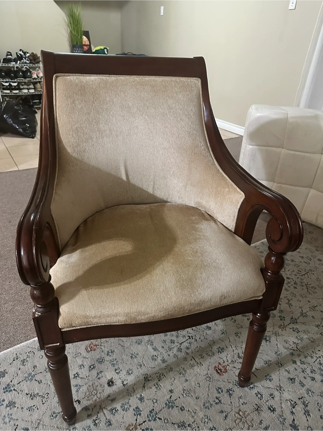 Selling a lovely armchair with a classic, antique-inspired design. It features a dark wood frame and comfortable beige fabric upholstery. It would be a great addition to any living room or study! I have two chairs.