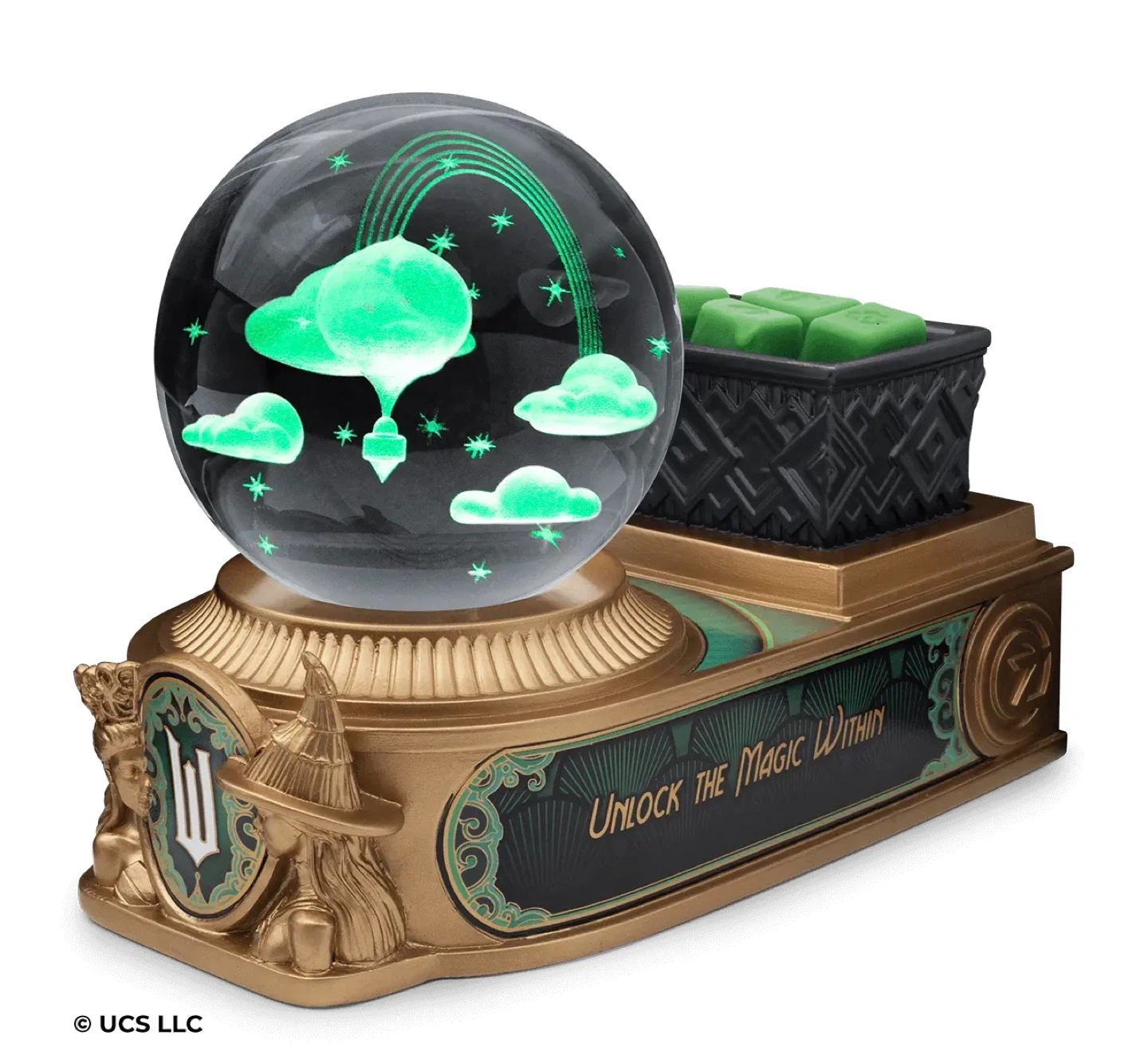 A spellbinding green glow illuminates the laser-etched display within this Warmer’s glass orb when lit. Below, representations of Glinda and Elphaba are rendered in an art deco style reminiscent of the Emerald City from Wicked. Each side of the base features a phrase inspired by a story of two halves