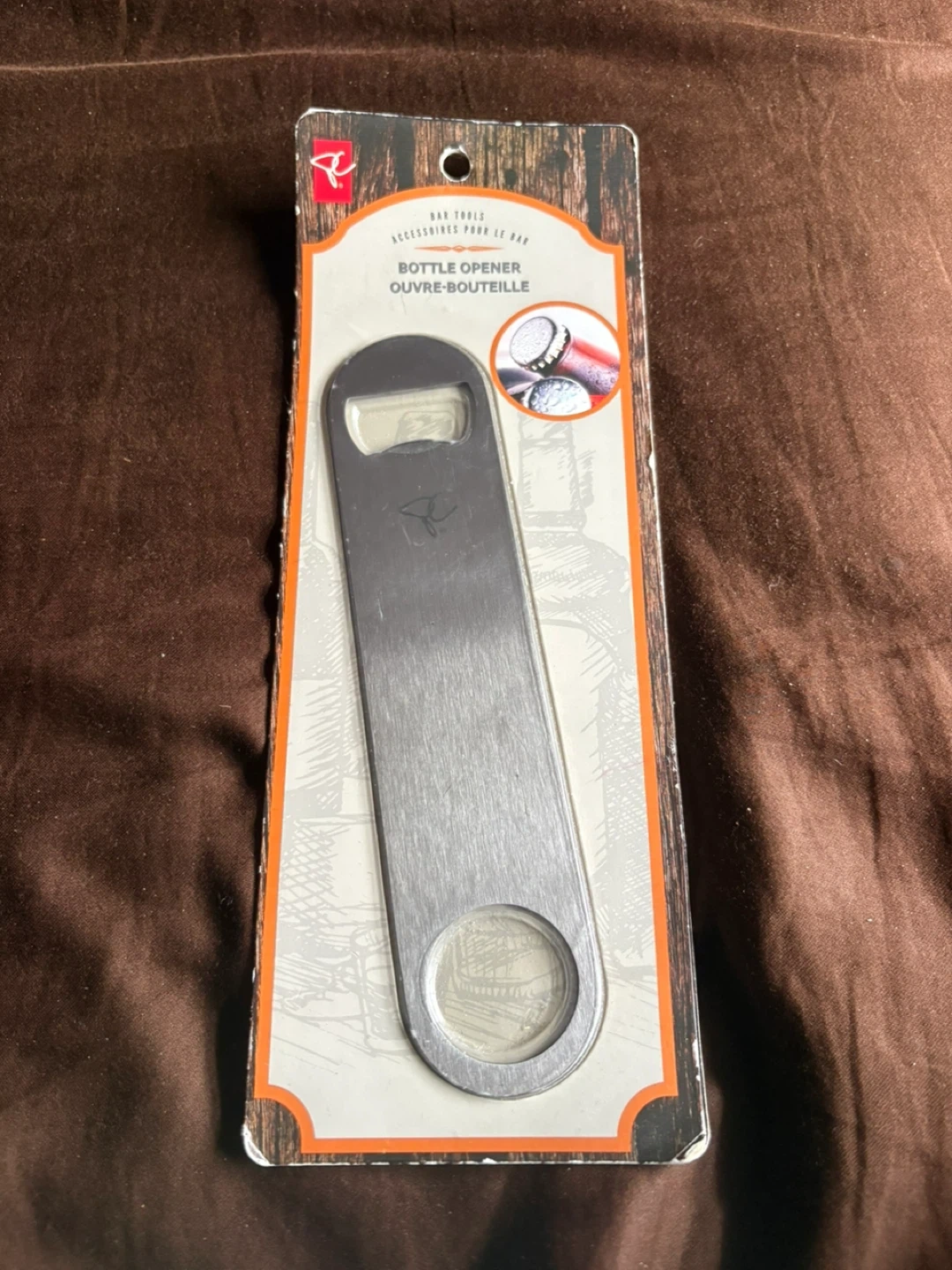This bottle opener is made of stainless steel. It features a durable, compact design. Always have this essential tool on hand for bottled beverages!