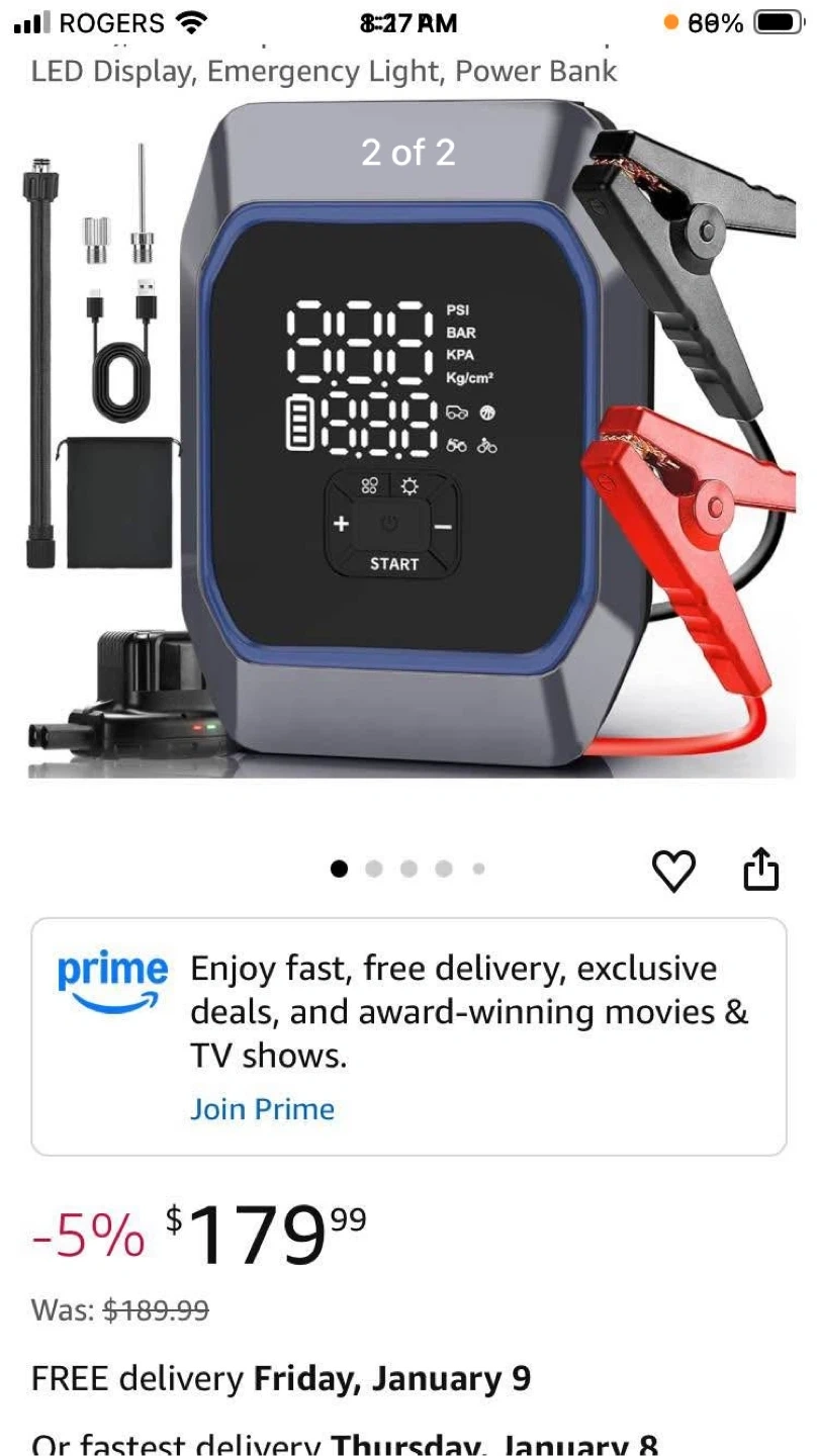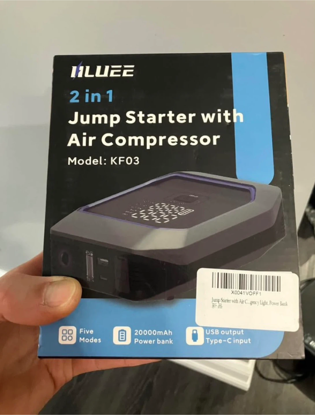 This ILUZE 2-in-1 jump starter and air compressor has a 20000mAh power bank. It's model KF03 and includes USB Type-C input. It also has a built-in LED display and emergency light. This is great for keeping in your car for unexpected needs!