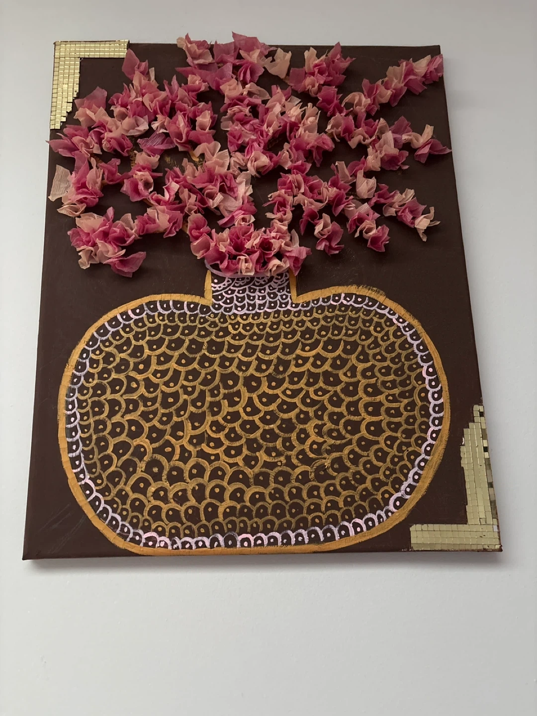 This framed wall art features a brown background with a decorative vase design in gold and white. Pink and light pink tissue paper flowers are attached to the top, creating a floral tree effect. Gold mosaic tiles accent the corners. It's a unique piece for home decoration!