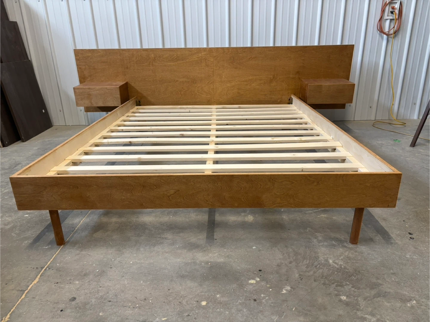 Brand new queen sized mid century style low profile bed frame. This bed frame feature a low profile modern design with an oversized headboard with integrated nightstands. The bed frame features birch veneers finished in a chestnut colour. No box spring required. It’s brand new and in great condition.