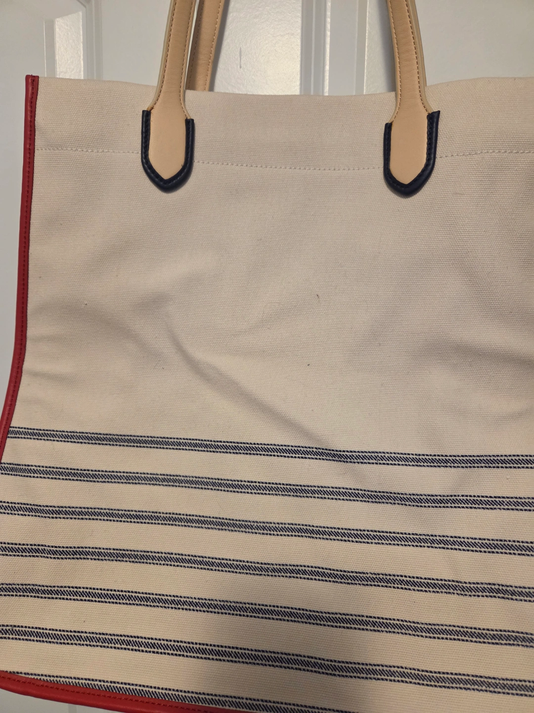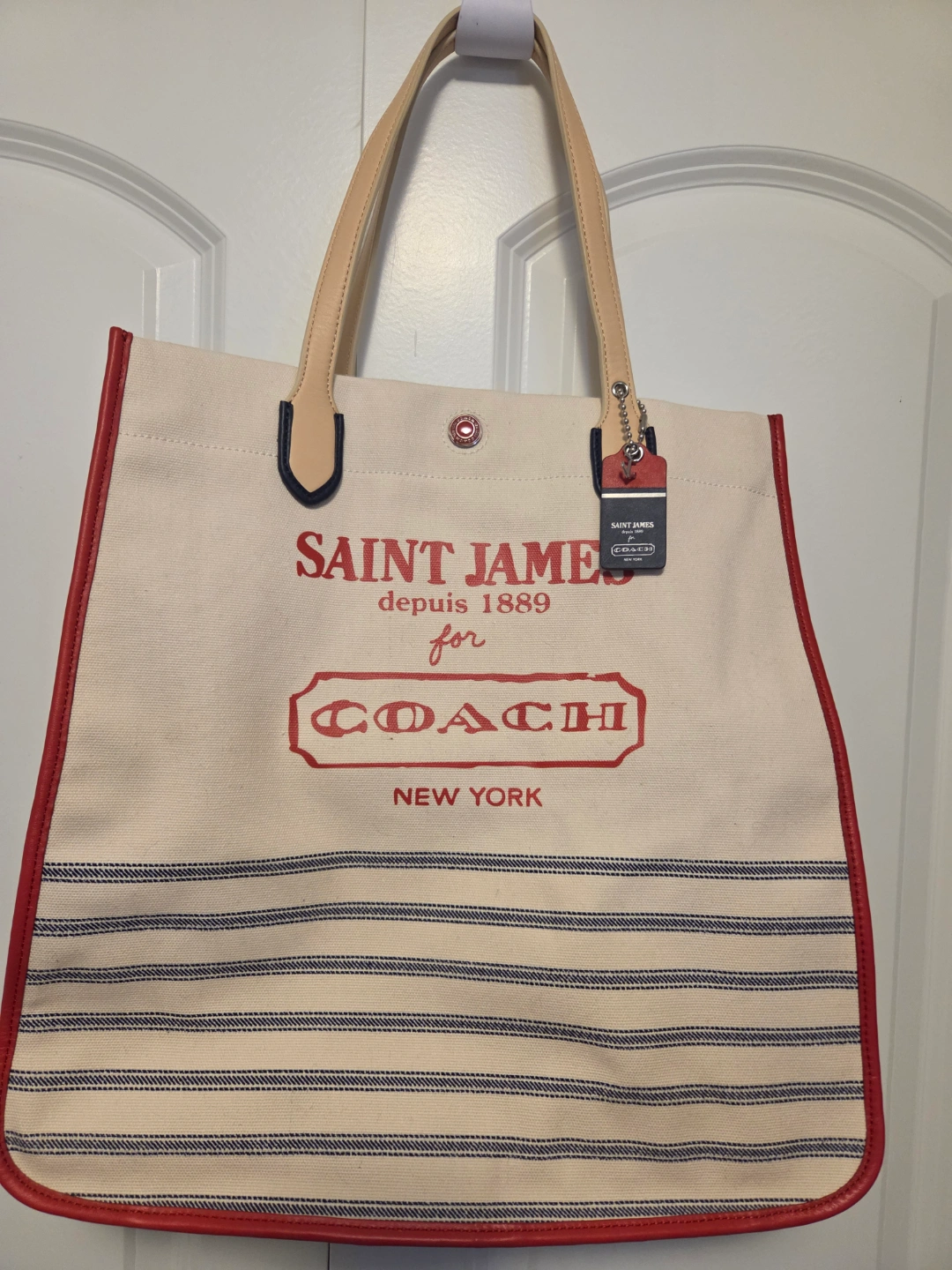 Large canvas tote bag. Cream coloured base with navy blue stripes and red accents. Leather handles and zipper closure. Interior pockets. Saint James for Coach collaboration. Brand new never used authentic coach canvas tote and dust bag.