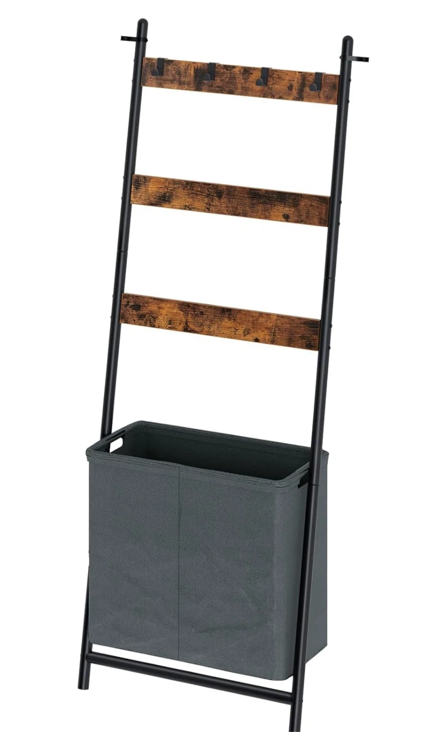 This ladder shelf comes with a handy laundry hamper! It's a great way to keep things organized and tidy. The shelves are a nice rustic brown, and the hamper is a neutral grey. Perfect for a small space or apartment