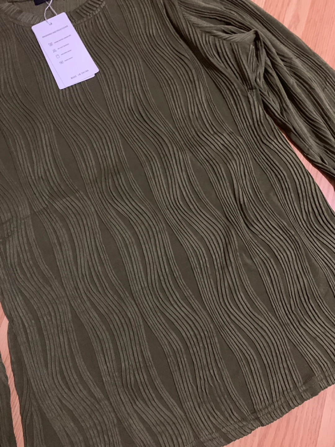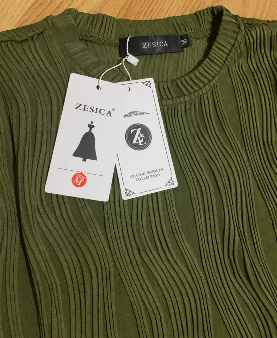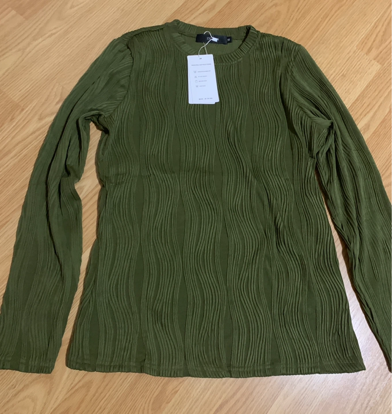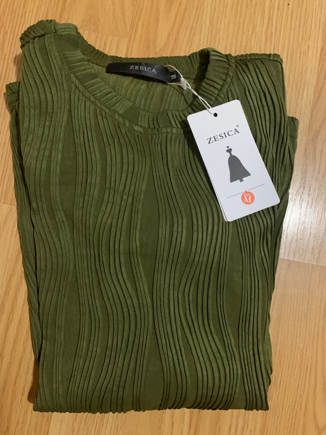 This is a ZESICA women's long-sleeve top in a lovely olive green colour. It's a size medium and features a unique textured fabric design. This top has a comfortable fit and can be dressed up or down.