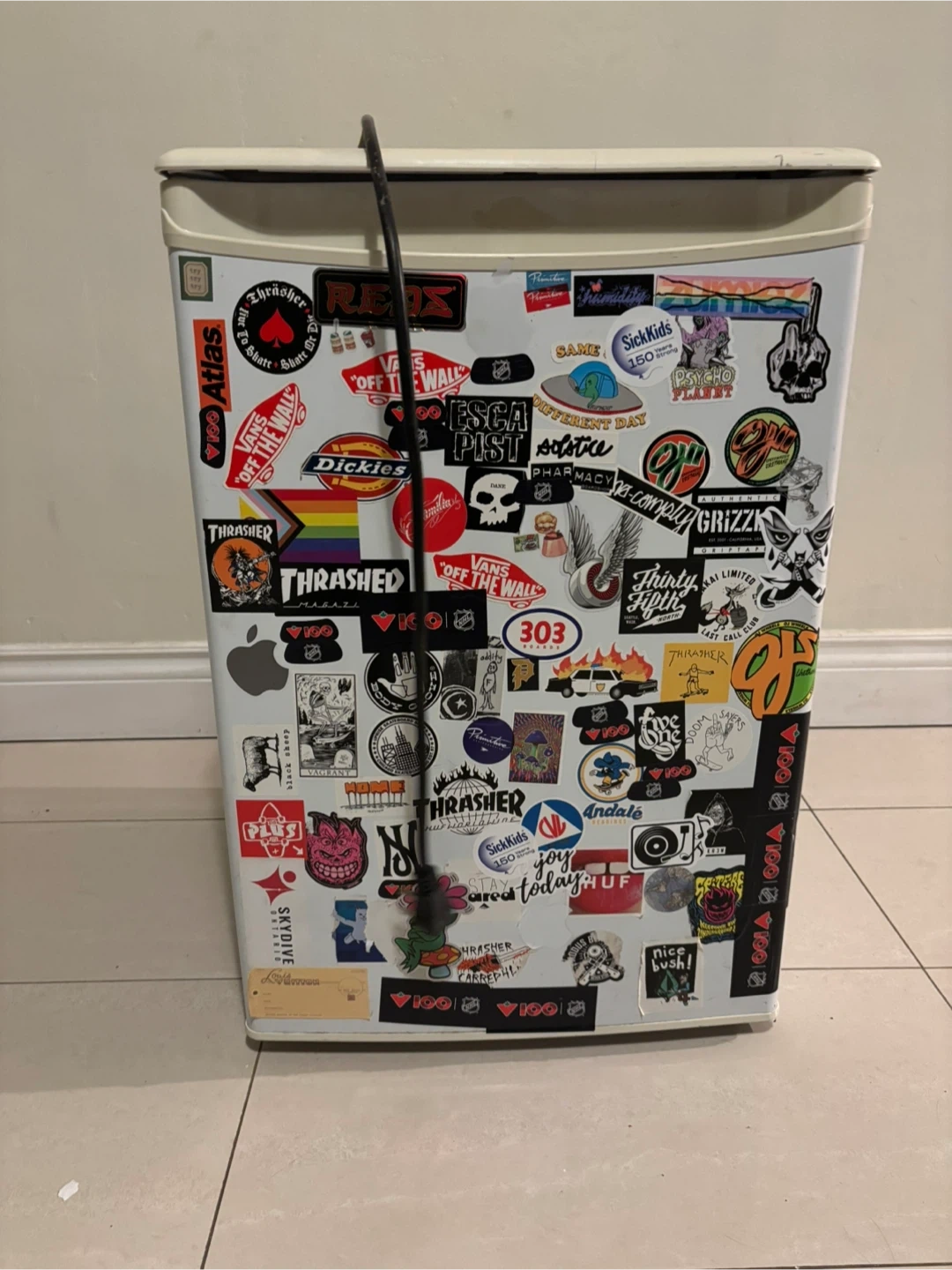 This is a mini fridge covered in stickers. It's been decorated with various designs and logos from popular brands and skate culture. Perfect for a dorm room or a man cave!