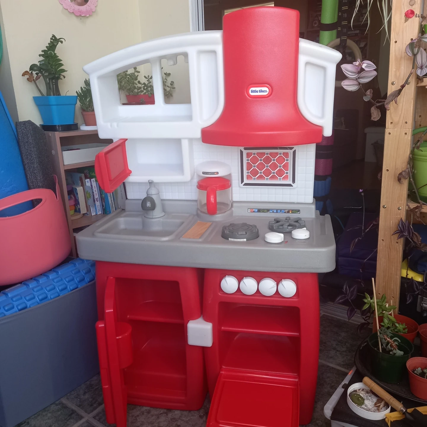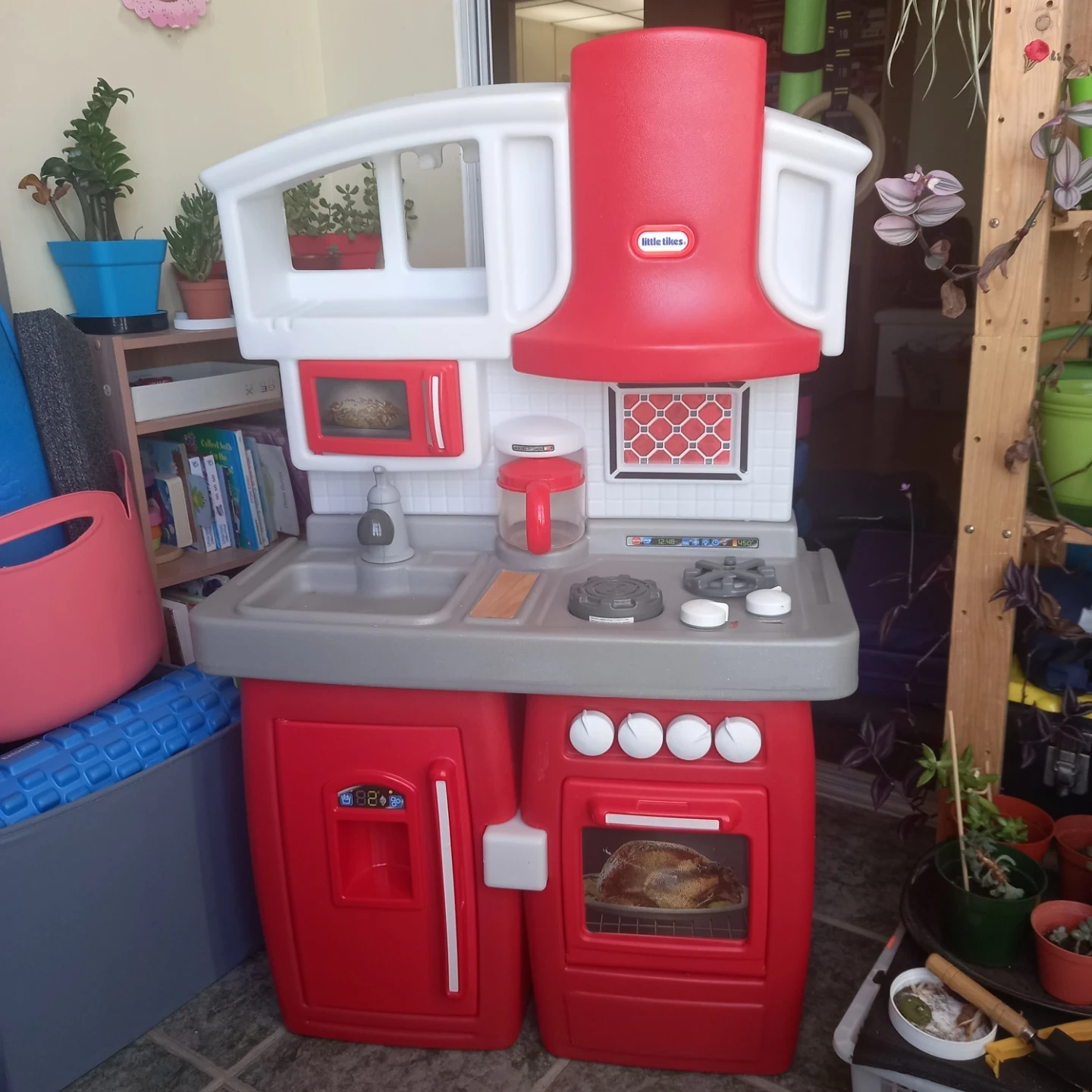 Little Tikes Super Chef kitchen with stove, oven, sink, and fridge. It's red and grey plastic. Includes coffee pot and wooden spoon accessory. This play kitchen is perfect for aspiring young chefs!