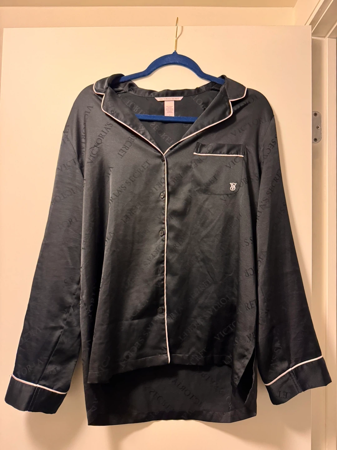 Victoria's Secret pajama set in size medium ! The set is black satin with light pink piping. The material is soft and comfortable, perfect for cozy nights in. Original price is 120 + tax. Wore it only a couple of times in perfect condition.