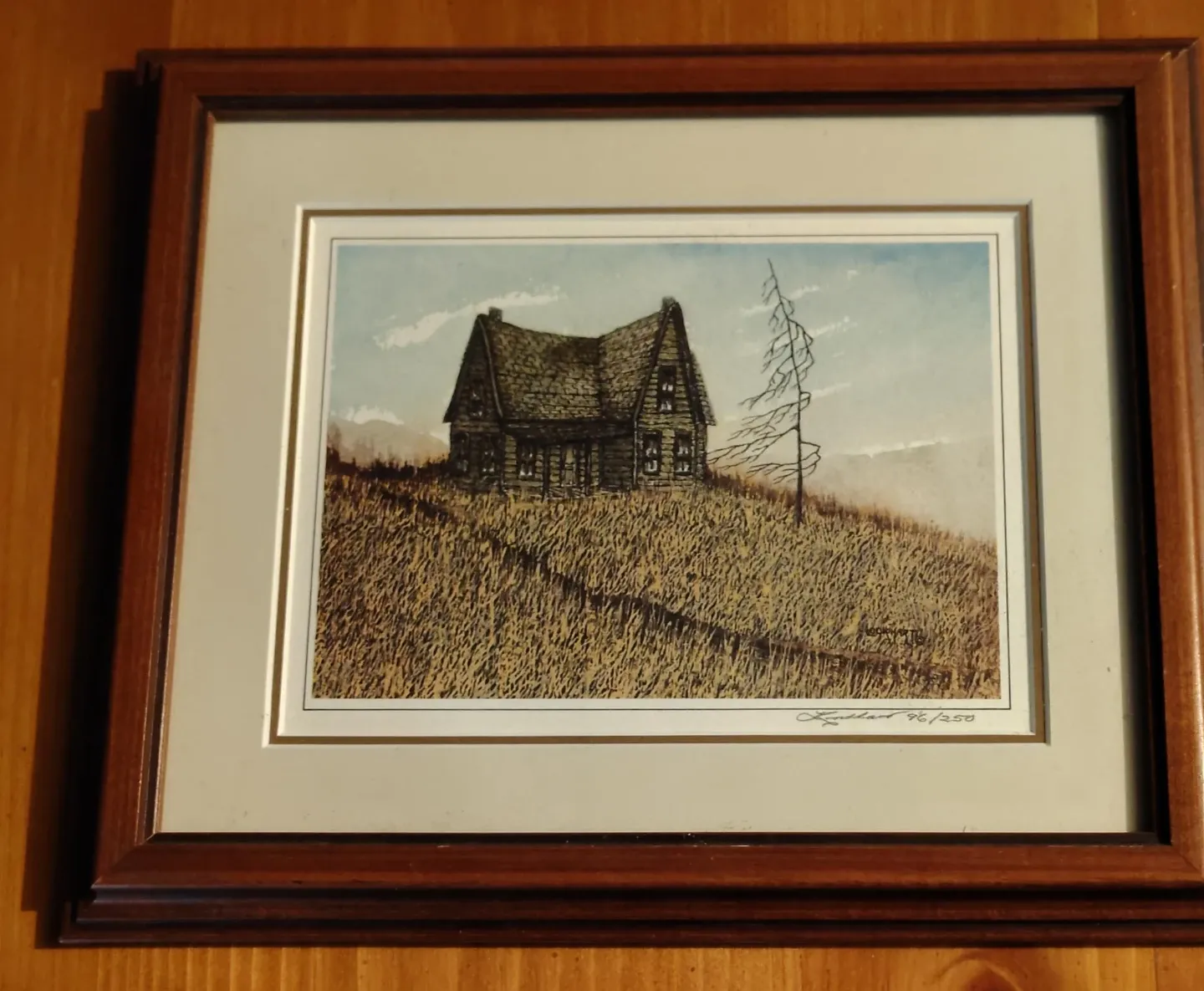This framed print depicts a rustic log cabin situated on a grassy hillside. The artwork is signed "Lindhart" and is numbered 96 out of 250. It's housed in a classic wooden frame with a mat.