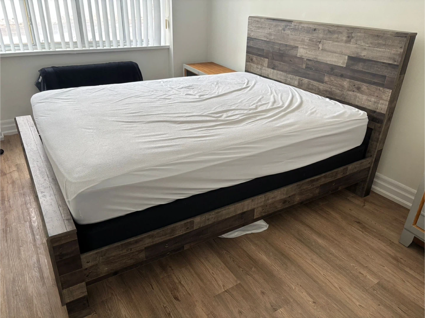 This queen bed frame features a rustic wood plank design for a charming, farmhouse look. It includes a sturdy headboard and a supportive foundation for your mattress. It's a great addition to any bedroom!