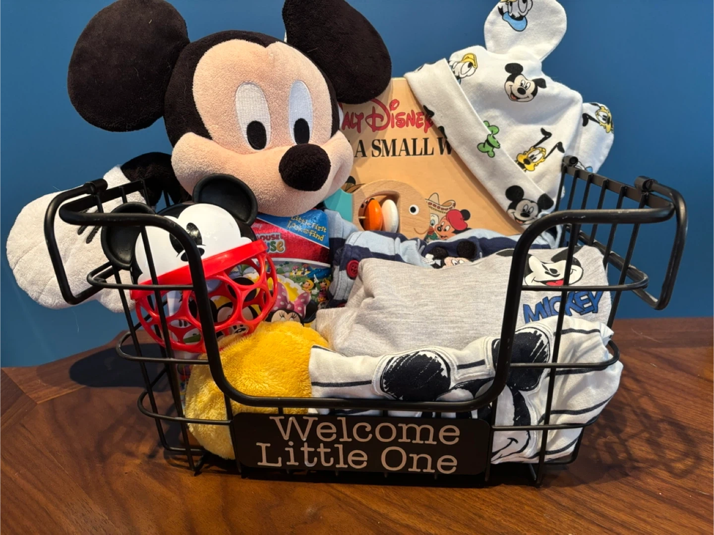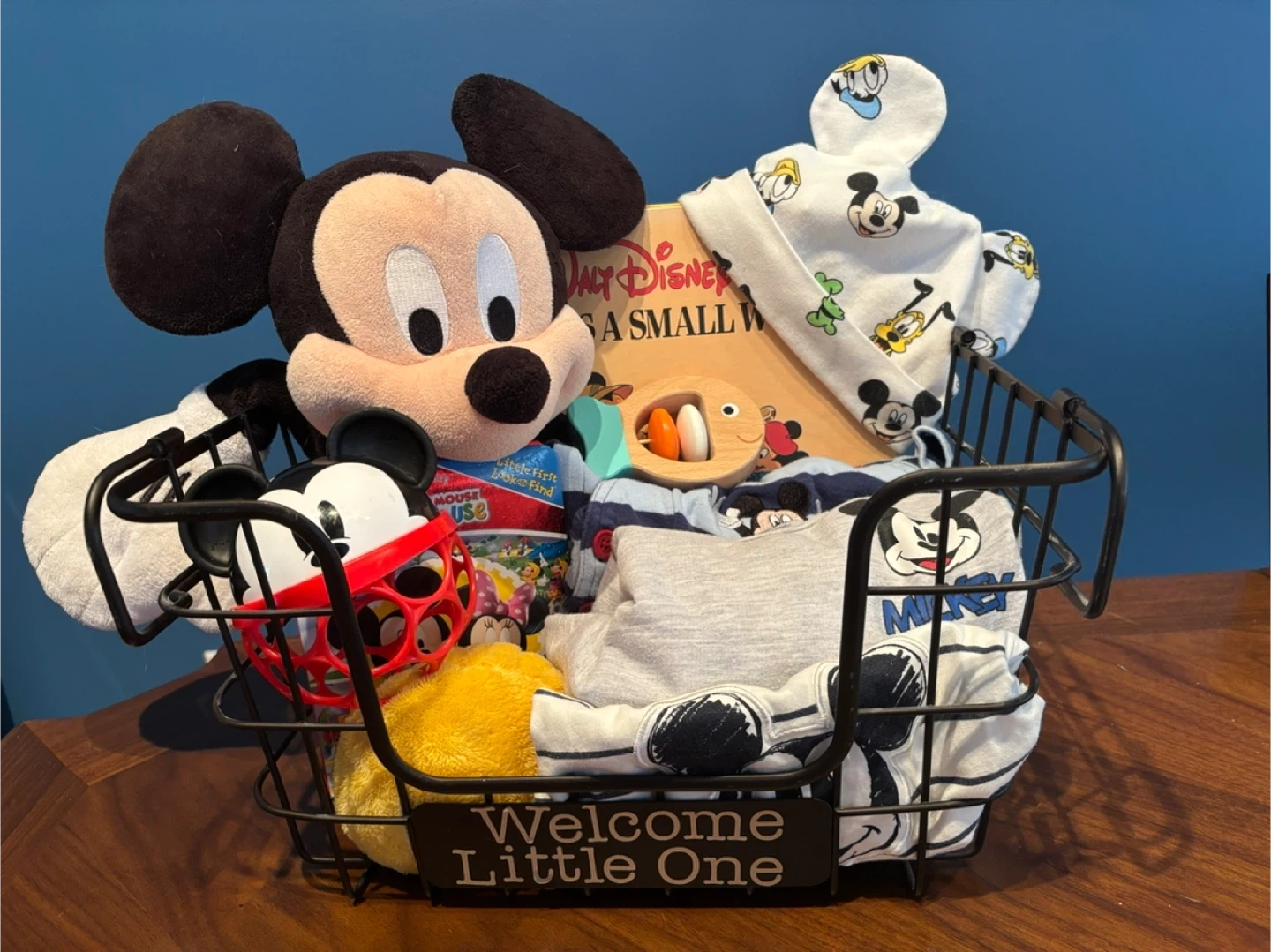 Adorable Disney Mickey Mouse themed baby gift basket, beautifully arranged and ready to gift. This set includes a mix of practical baby essentials and cute keepsakes any Disney-loving family will enjoy.