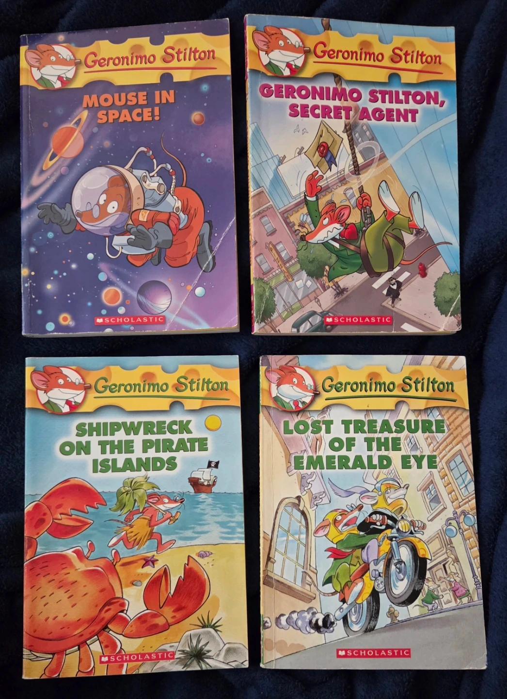 This is a collection of 8 Geronimo Stilton books. Titles include Red Pizzas for a Blue Count, Attack of the Bandit Cats, A Fabumouse Vacation for Geronimo, The Phantom of the Subway, Mouse in Space!, Geronimo Stilton, Secret Agent, Shipwreck on the Pirate Islands, and Lost Treasure of the Emerald Eye. These books are great for young readers.