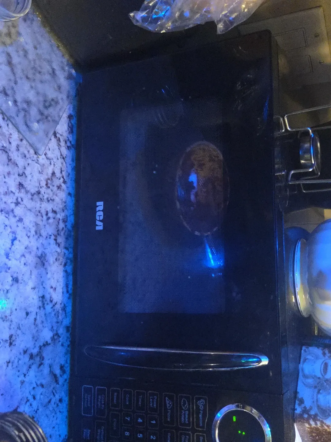This is a black RCA microwave oven. It has a digital display and various pre-set cooking options like popcorn, potato, and pizza. The control panel includes a timer and power level settings.