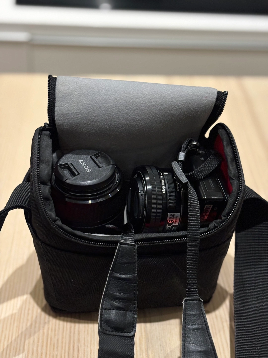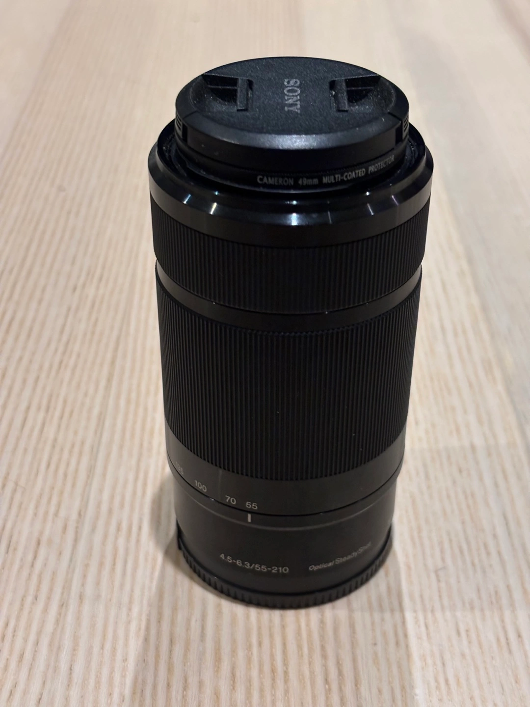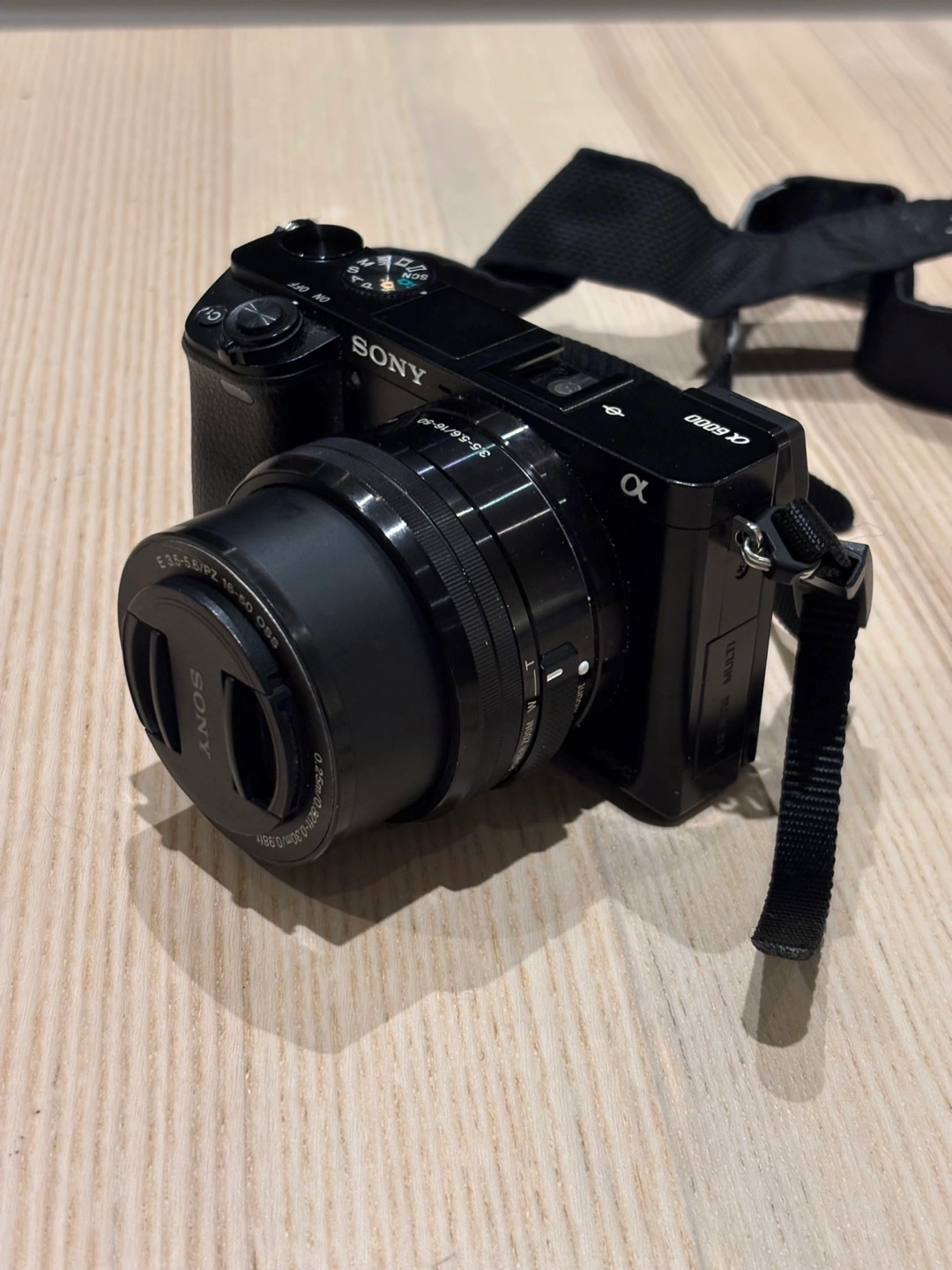 Sony Alpha 6000 mirrorless camera. Includes a 55-210mm telephoto lens. Black camera with a black strap. Excellent condition. Bag included.