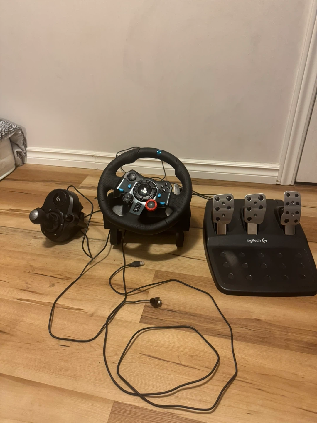 This Logitech G29 racing wheel and pedal set is ready for the race track. It features a leather-stitched wheel rim and metal pedals for a realistic feel. Also includes the Logitech Driving Force Shifter accessory for enhanced gameplay. ill been using them for only 2 months and i was bored soo im traying to sell this for now because i dont need it anymore, its good for racing gaming
