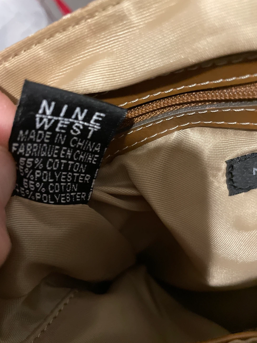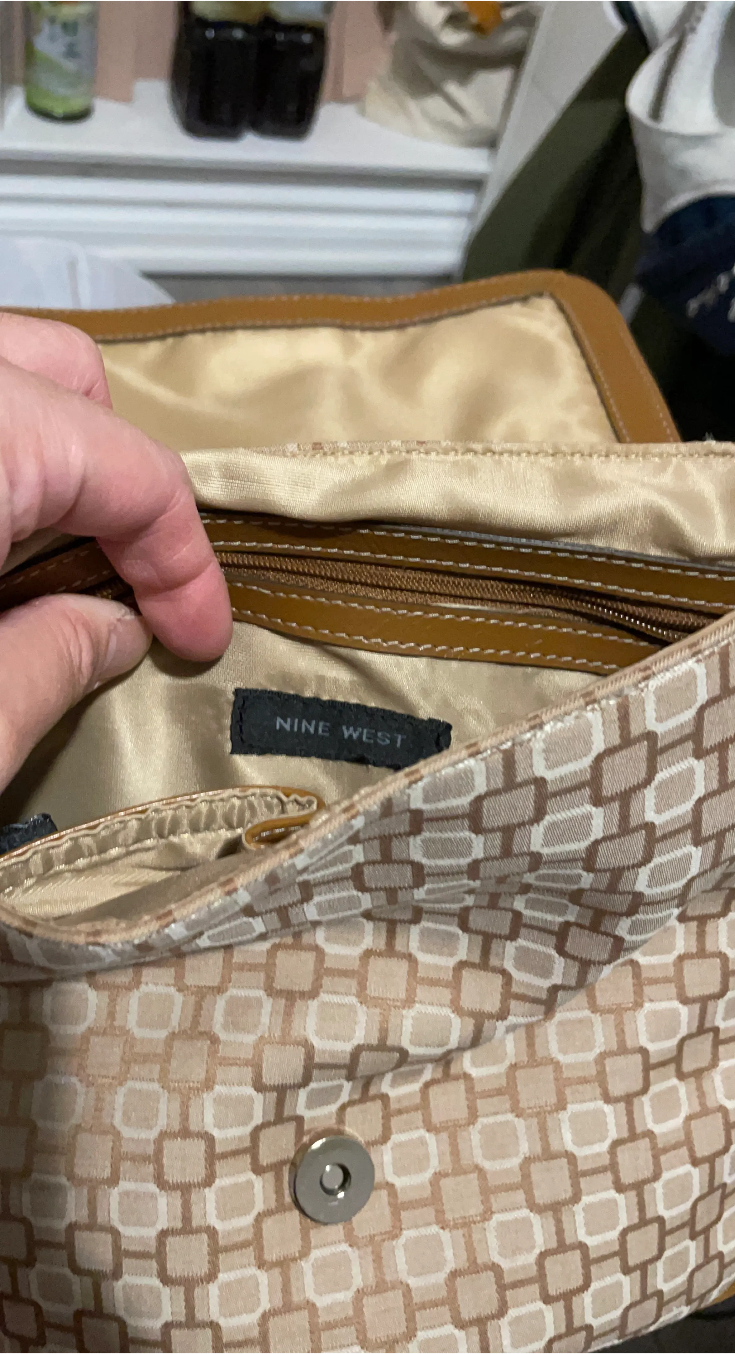 This Nine West shoulder bag features a brown and tan patterned exterior with faux leather trim. It's made with 55% cotton and 45% polyester. The strap is adjustable.