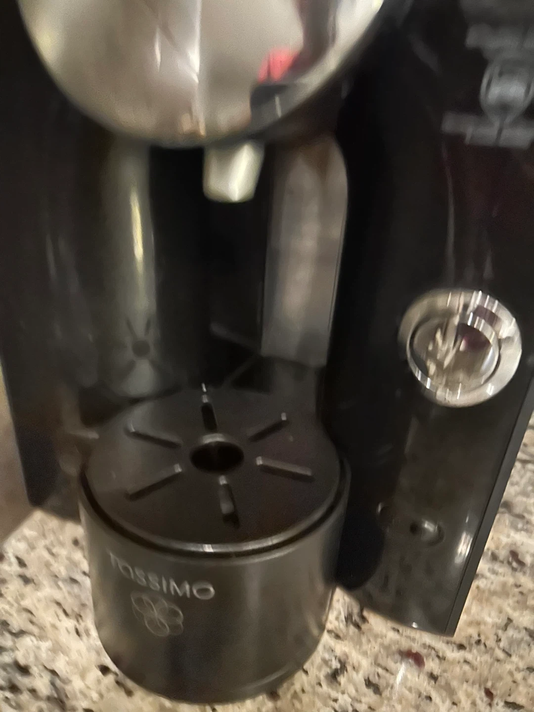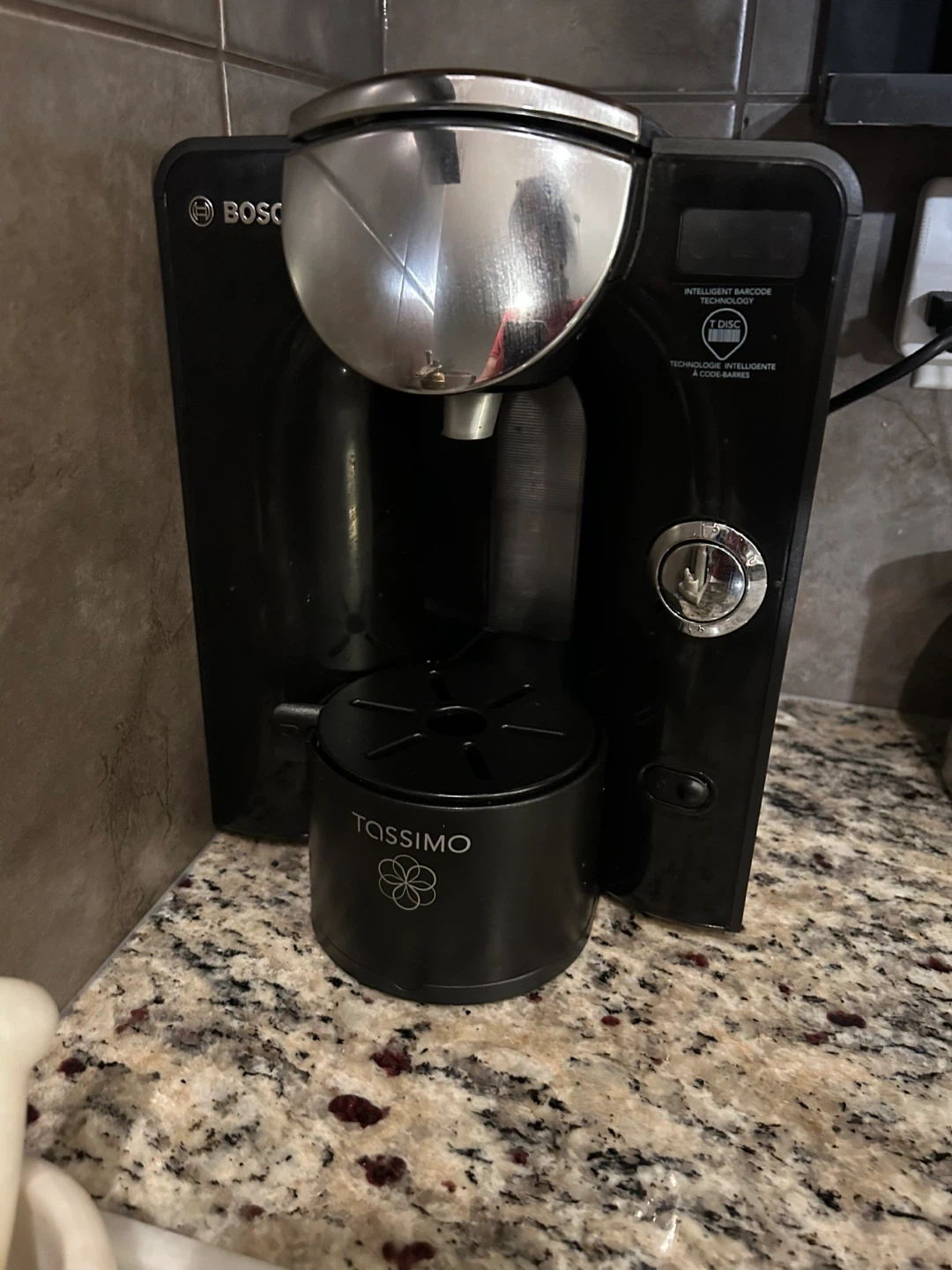 This is a black Bosch TASSIMO coffee machine with intelligent barcode technology. It features a removable drip tray for cup height adjustment. Suitable for making single-serve beverages.