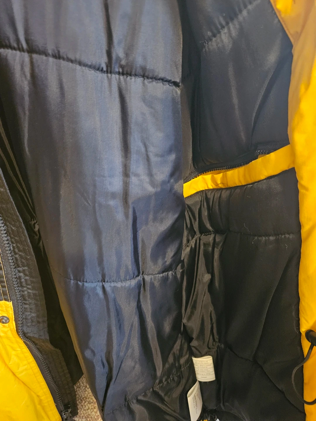 Yellow and black Weather Gear puffer jacket. It's a medium/medium size. Lined with black, quilted material for warmth. Hood neatly tucked inside collar with zipper and snap closing options.