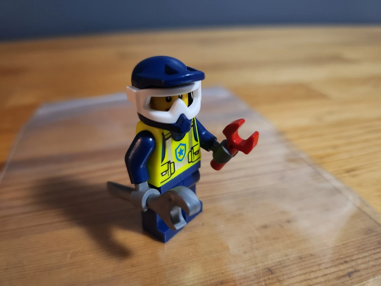 This LEGO minifigure dressed as a mechanic comes with several accessories including a helmet, goggles, a wrench, and a red tool. The figure has a yellow vest with blue sleeves and dark blue pants.