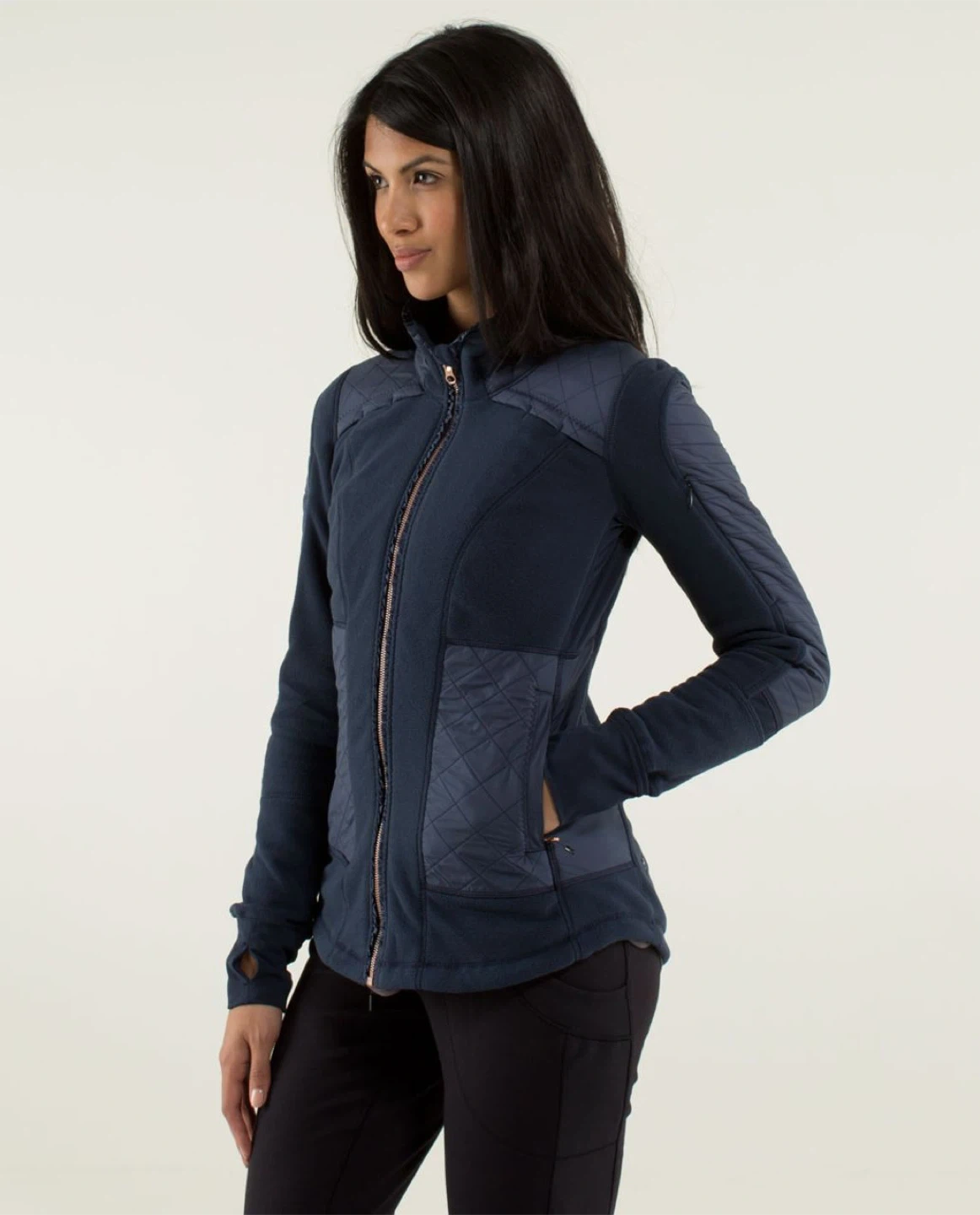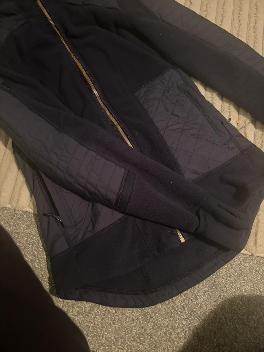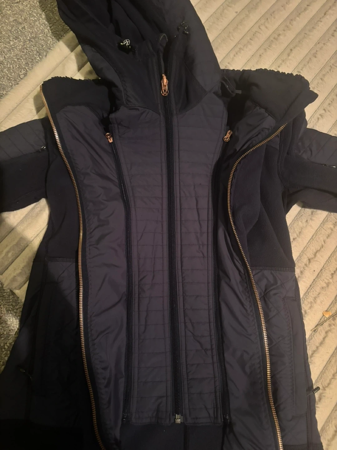 These were released quite a few years ago and sold out really fast.. It’s basically two jackets in one… as you can take the middle part out and the hood and just wear the fleece.. this one is a navy blue with rose gold zipper. Of only worn it maybe 4 to 5 times… it’s like new condition! Very flattering fit. Retailed for $198plus tax. It’s the perfect jacket for layering, especially in these brutal cold months.. also a great jacket for the spring or fall!!