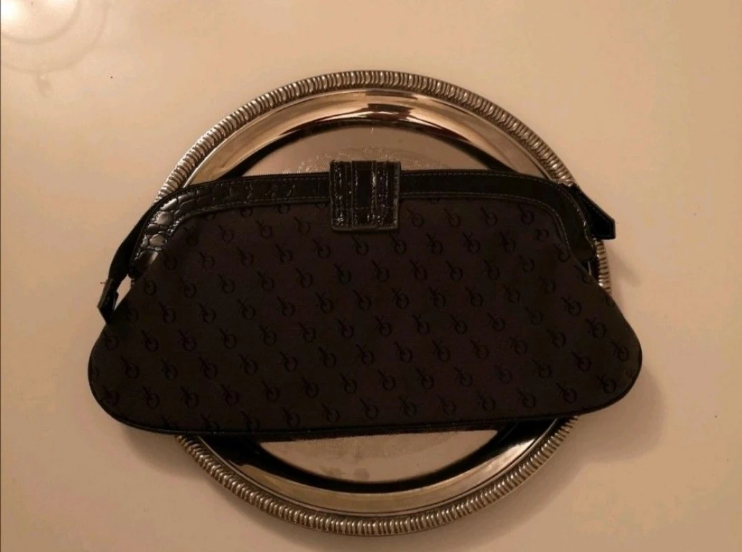 Metal XOXO clasp. Fabric clutch around, embossed with XOXO logo. Inside zipper pocket. Button clasp closure. leather trimming.