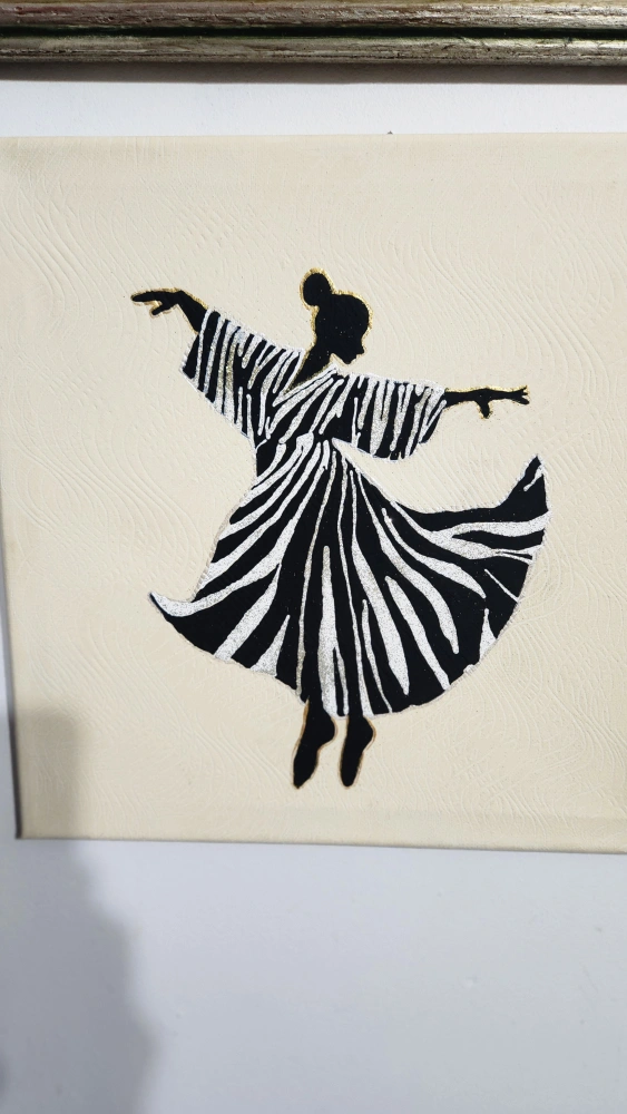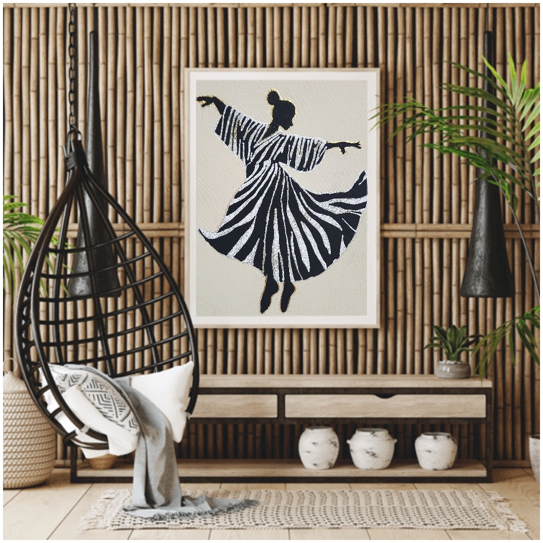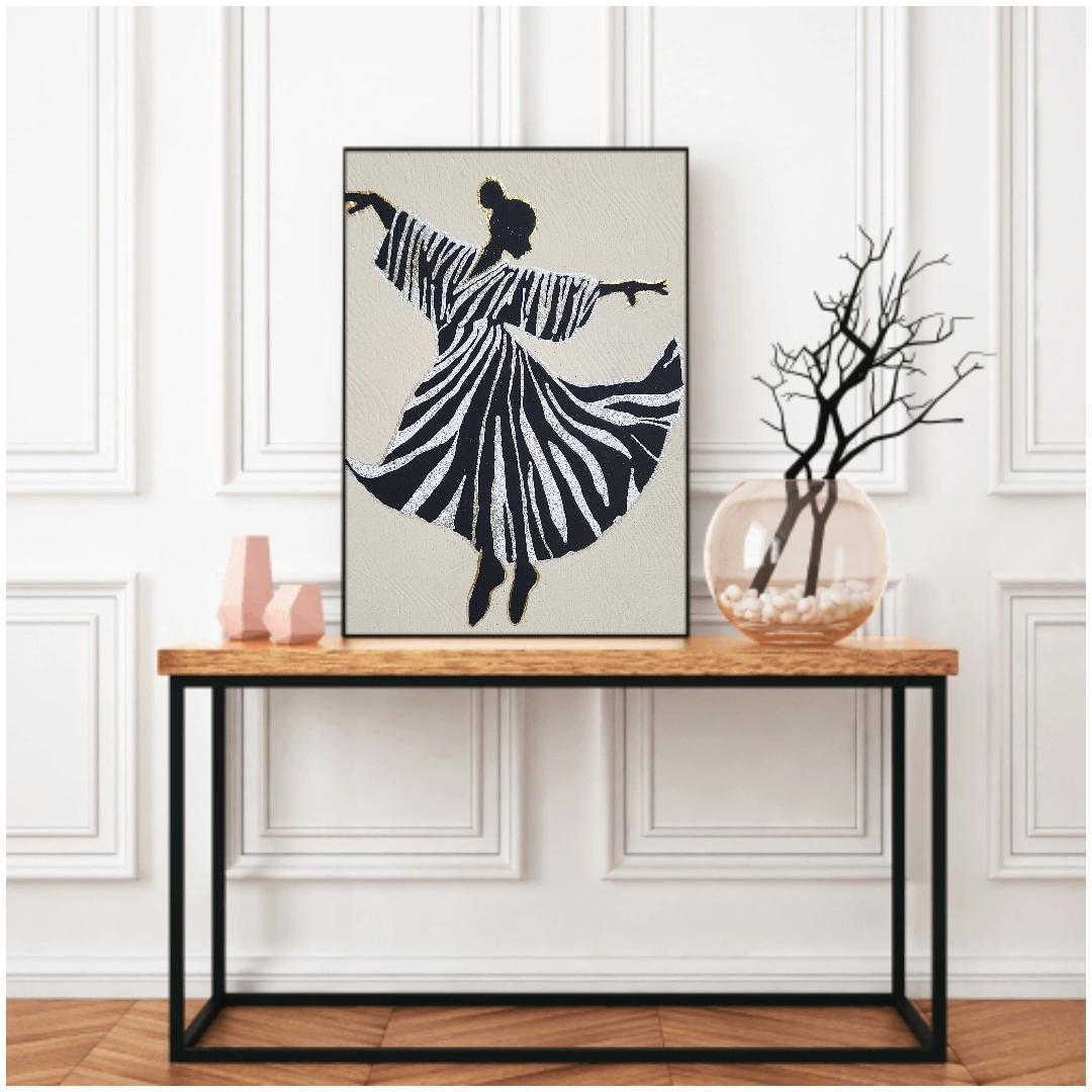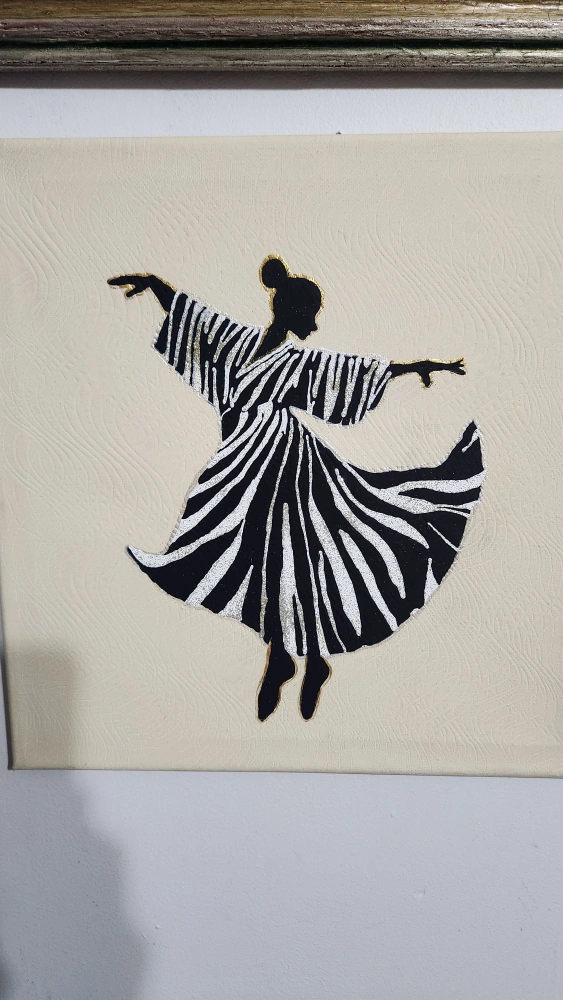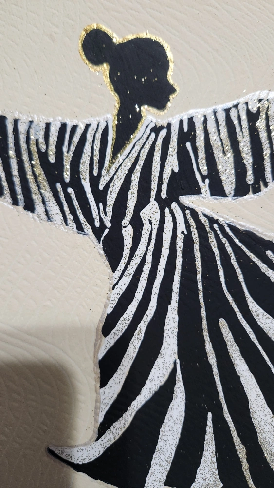 Canvas art featuring a silhouette of a woman dancing, with black and white stripes and gold accents.
