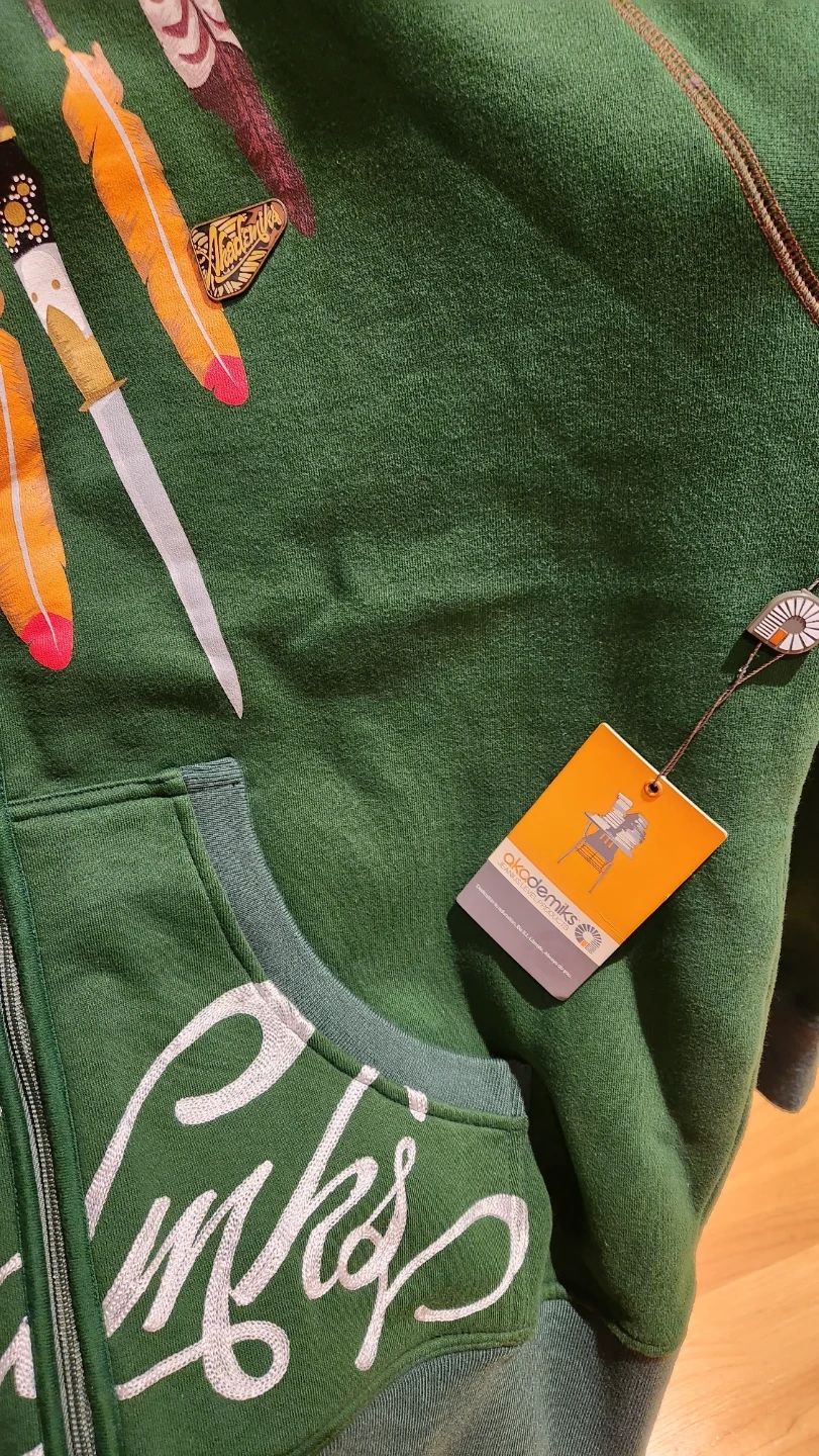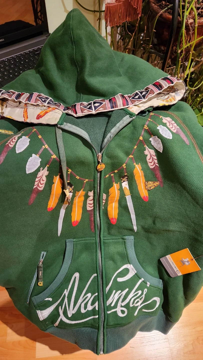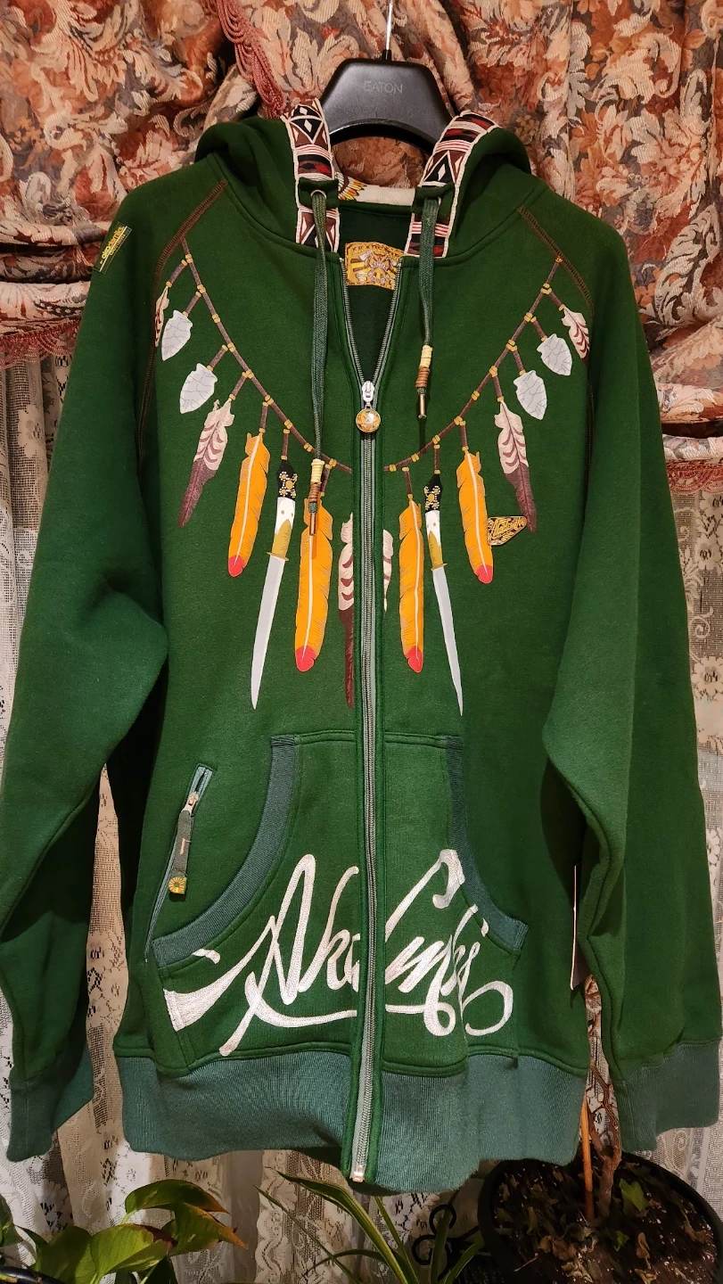 This green zip-up hoodie is from Akademiks brand and features a unique indigenous graph. It's a comfortable and stylish piece for casual wear. Made with a soft fabric blend.