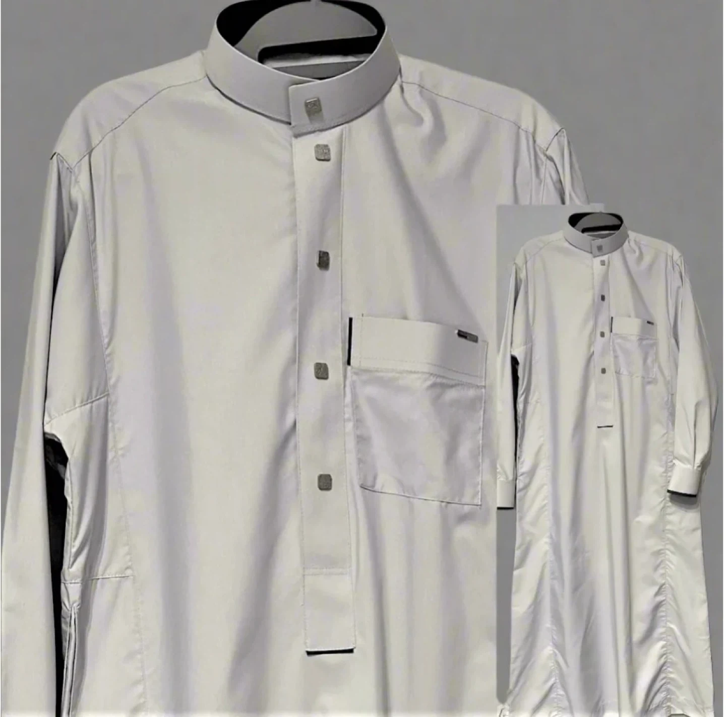 A men's jubba thobe in a light grey colour. It features a mandarin collar with snap closures and a single chest pocket. Made from a lightweight fabric.