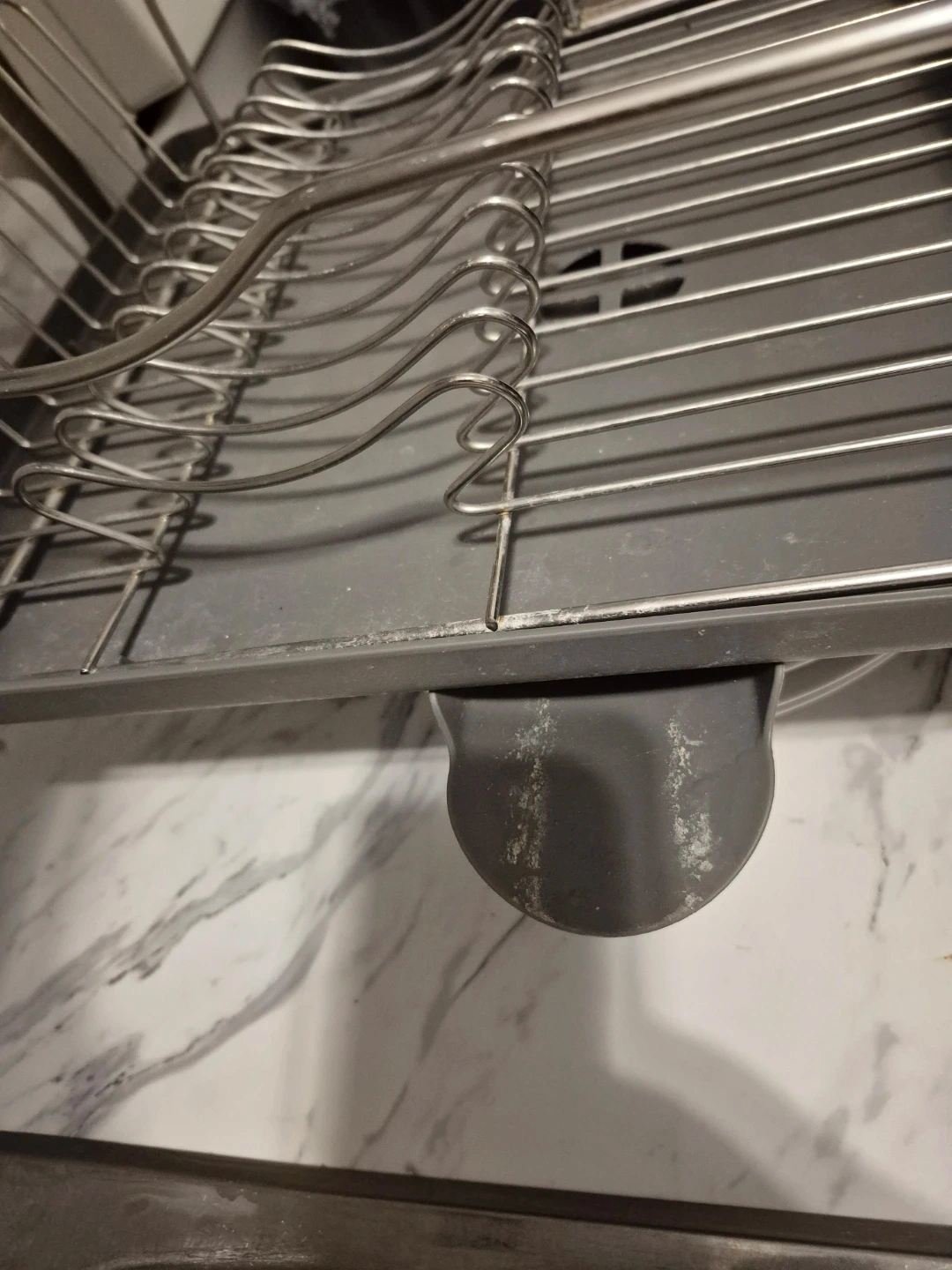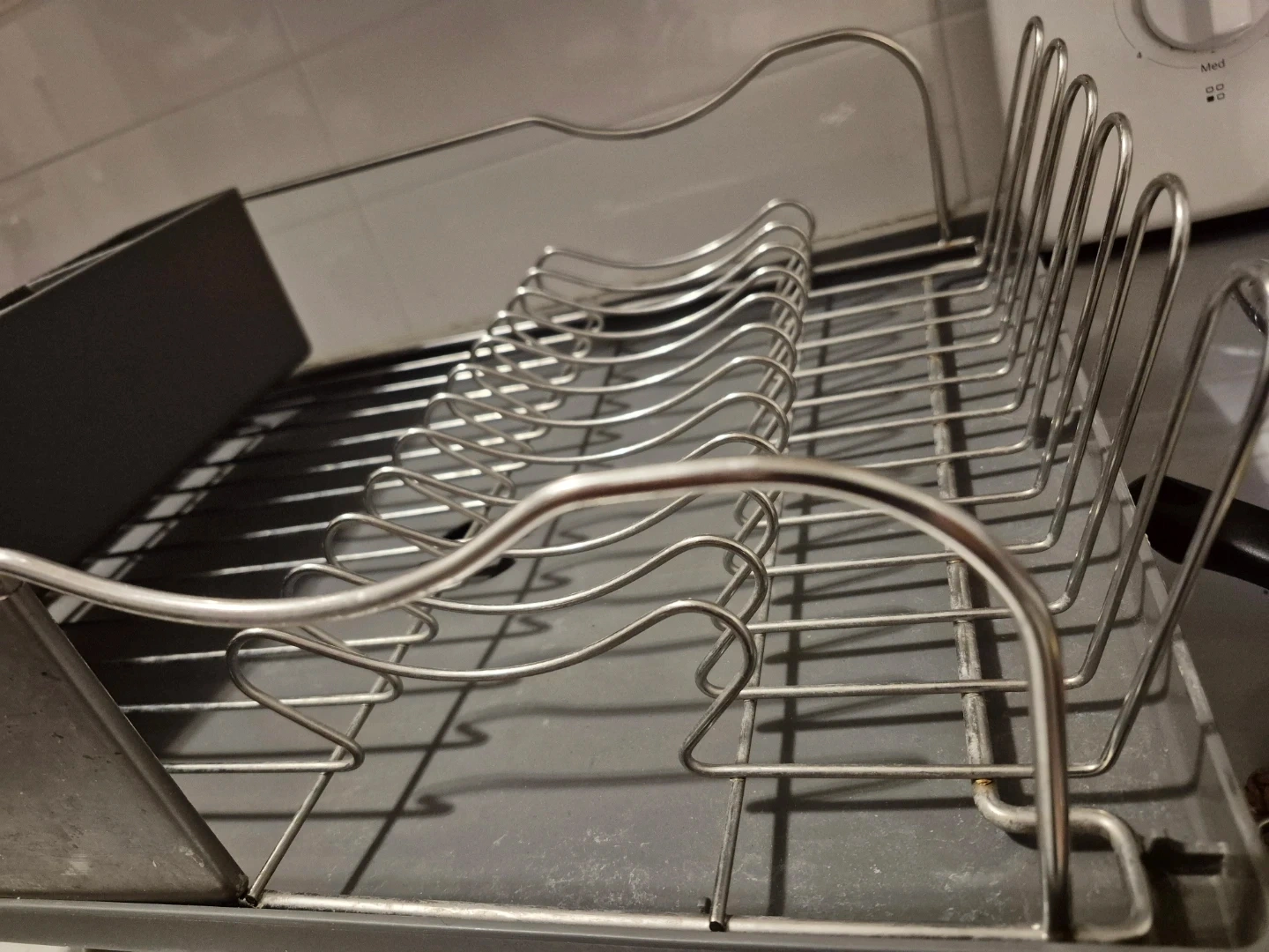 This dish drying rack is made of durable metal with a grey plastic cutlery holder. It has multiple slots to hold plates and cups, plus sections for organizing silverware.