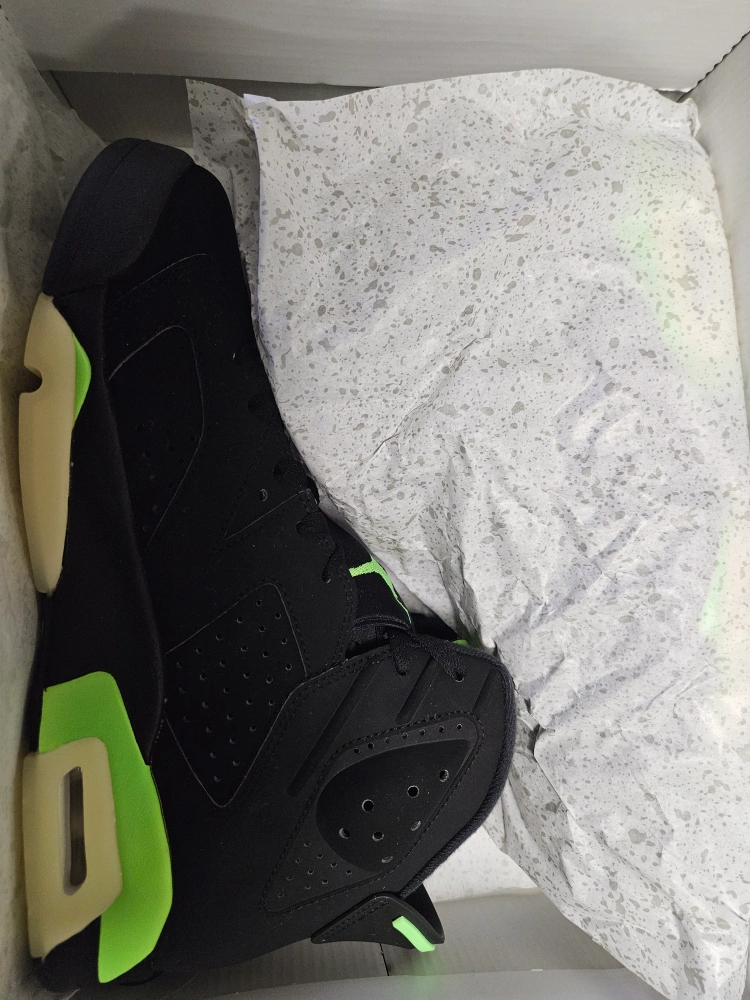 Black and neon green Air Jordan 6 Retro sneakers. Comes with original box. A classic silhouette with a vibrant colourway.