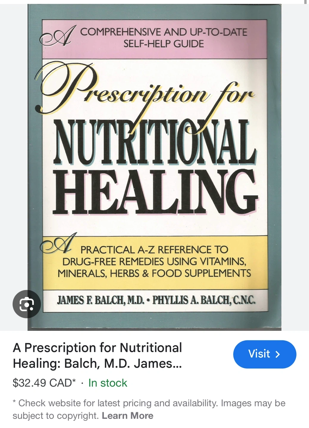 Selling a copy of 'Prescription for Nutritional Healing' by James F. Balch, M.D. and Phyllis A. Balch, C.N.C. It's a comprehensive guide and practical A-Z reference to drug-free remedies using vitamins, minerals, herbs, and food supplements.