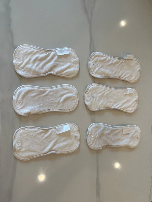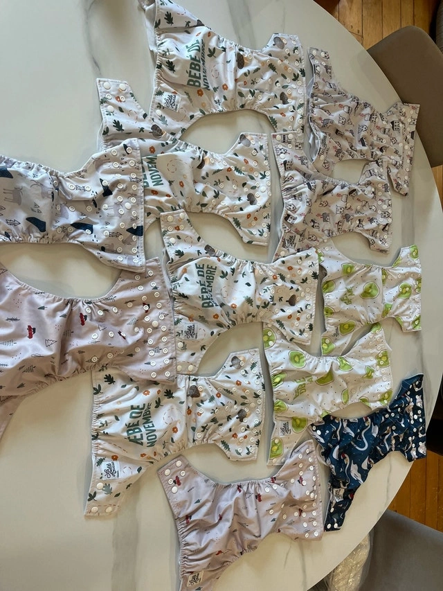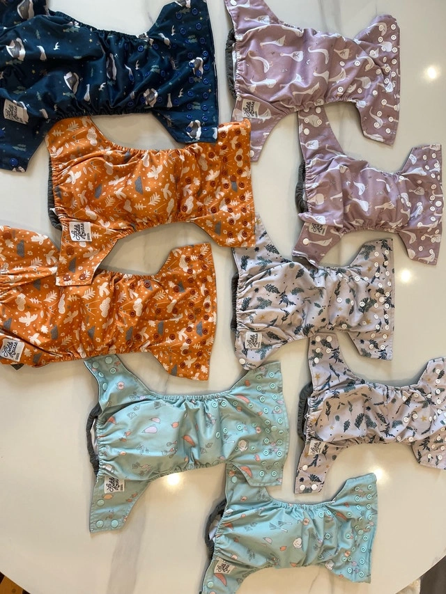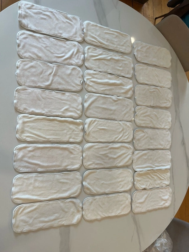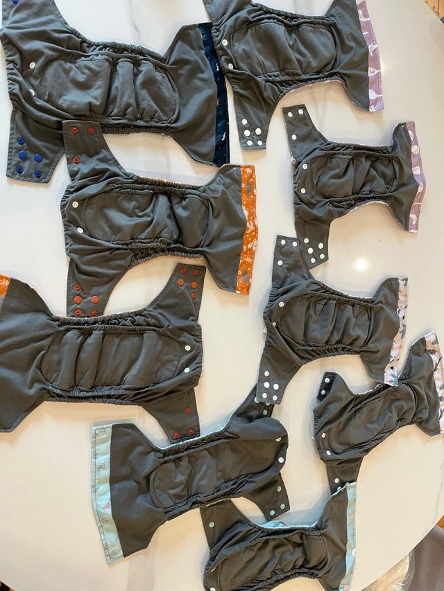 Machine washable, adjustable cloth diapers. Includes 12 Plain Shells, 9 Charcoal Shells with built-in pads, 24 Plain pads, 9 Charcoal pads, 6 Bonus Pads, and 10 Diaper Liners. Pictures show both sides of the diapers and pads. They are bleached and ready to use.