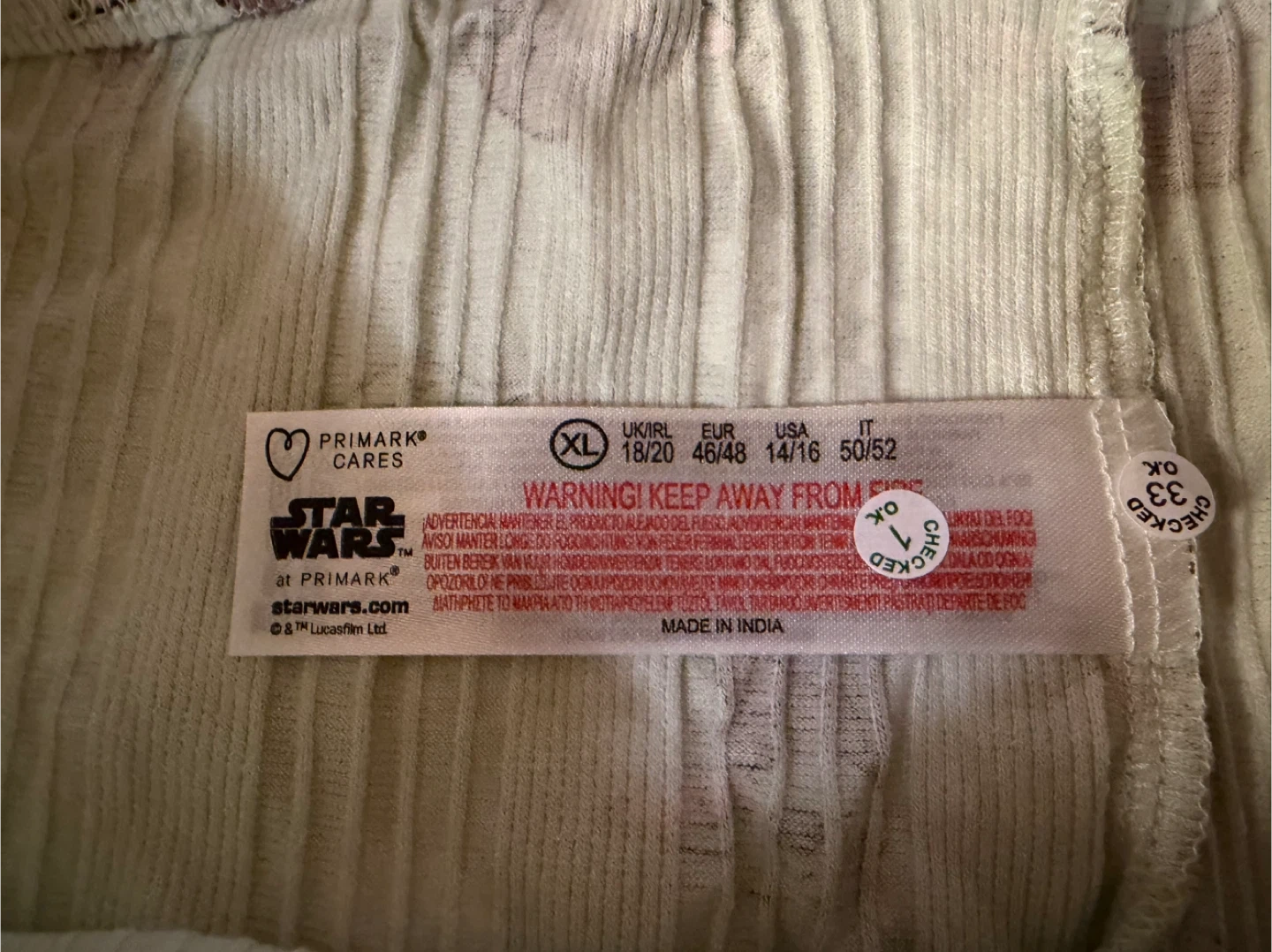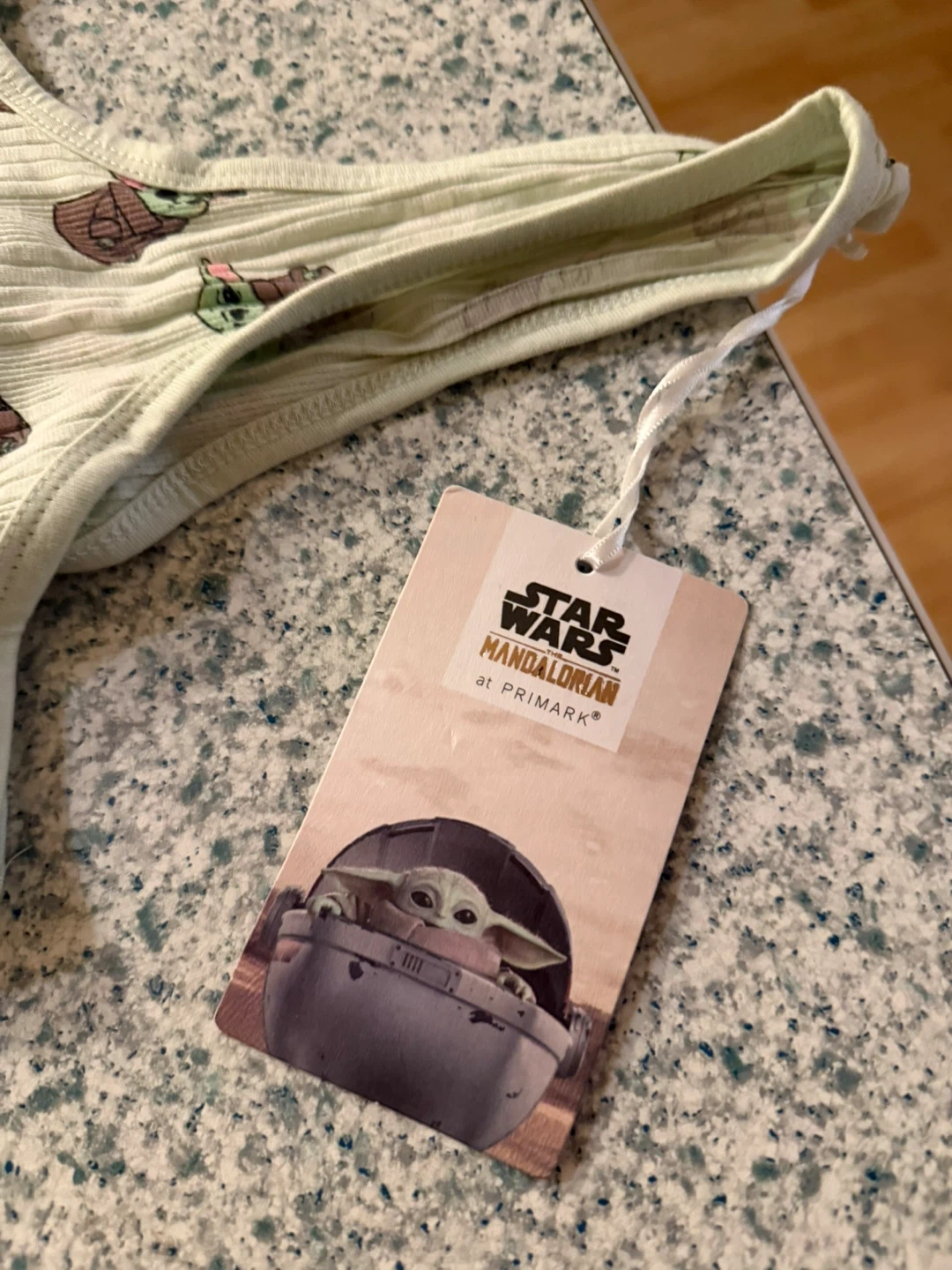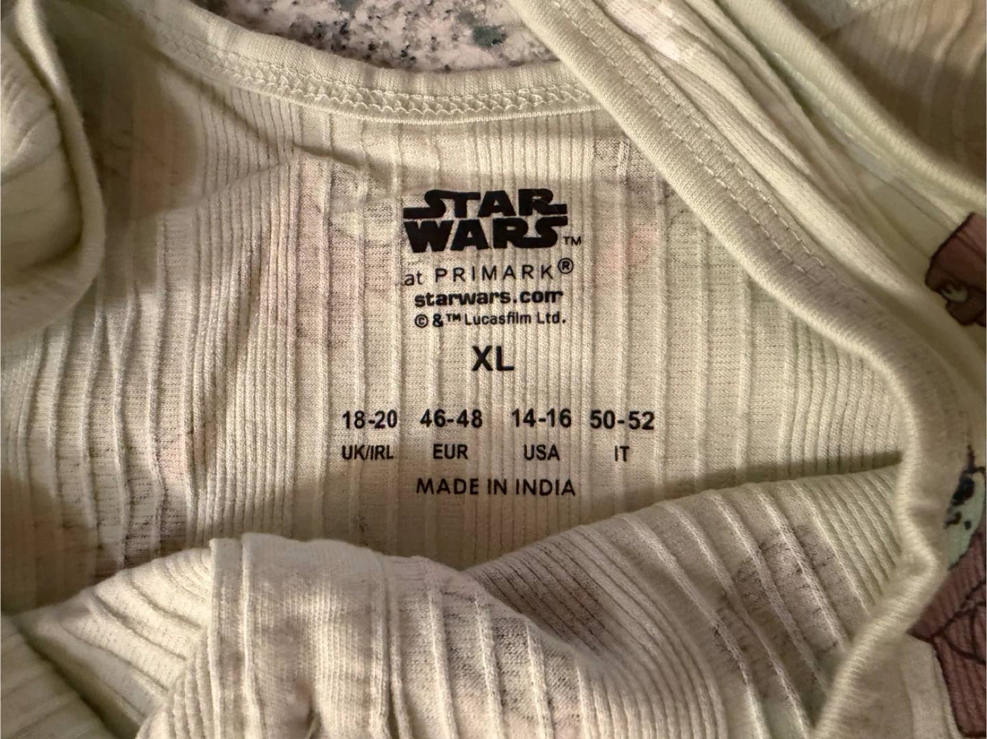 This light green pajama set features a Star Wars Mandalorian print with Baby Yoda. It's a size XL, made in India, and includes a tank top and shorts. Great for fans of the show!
