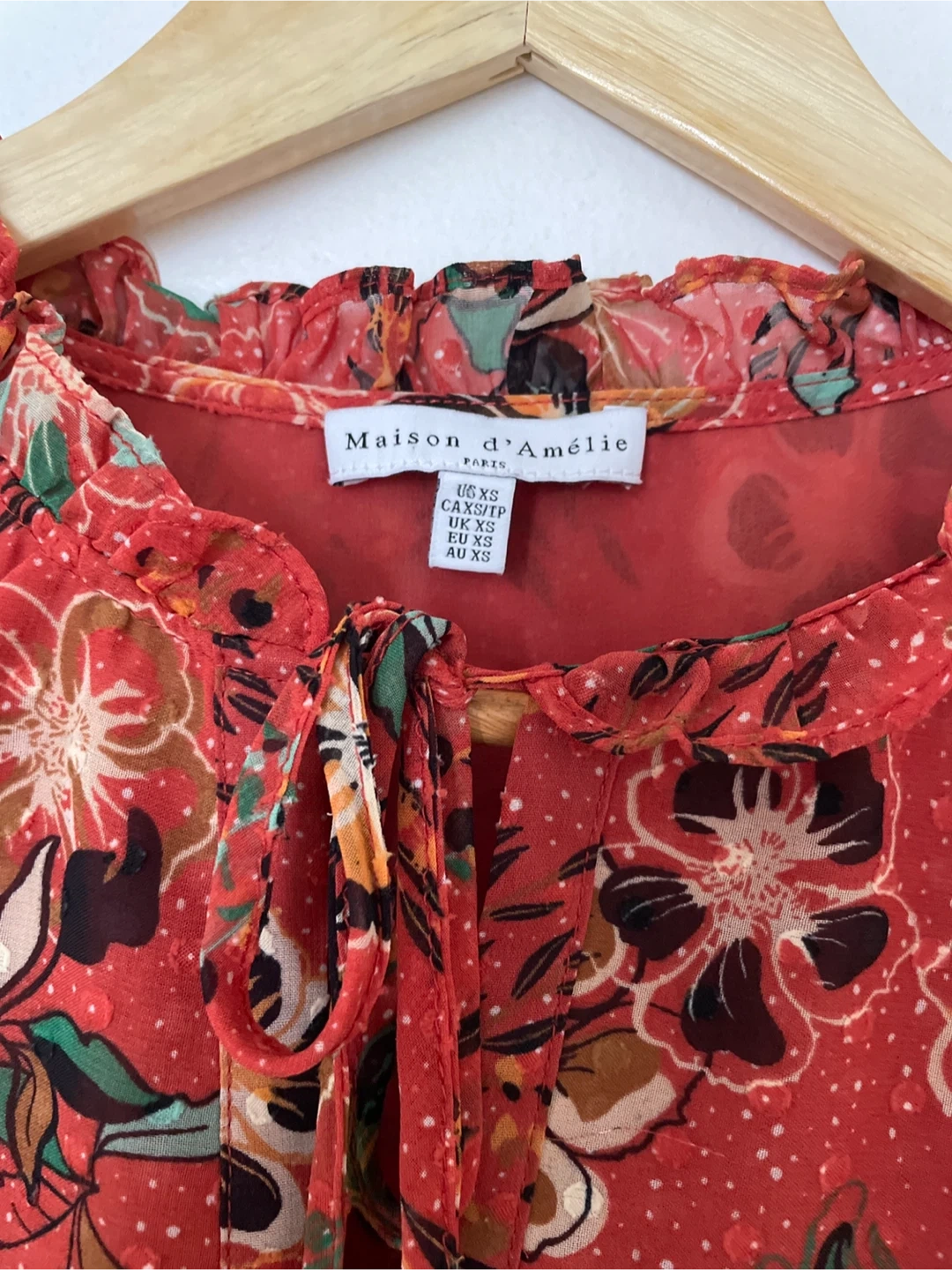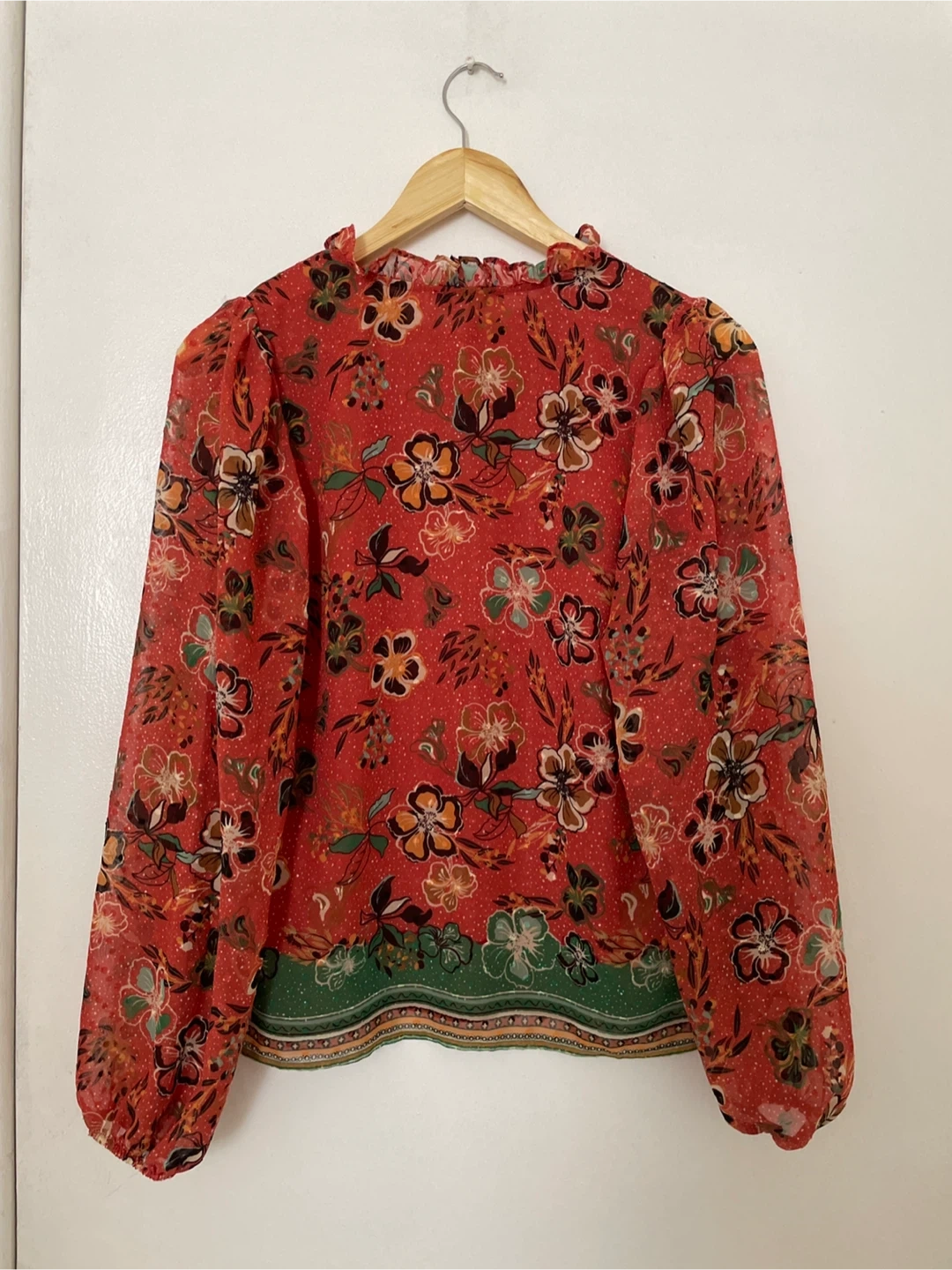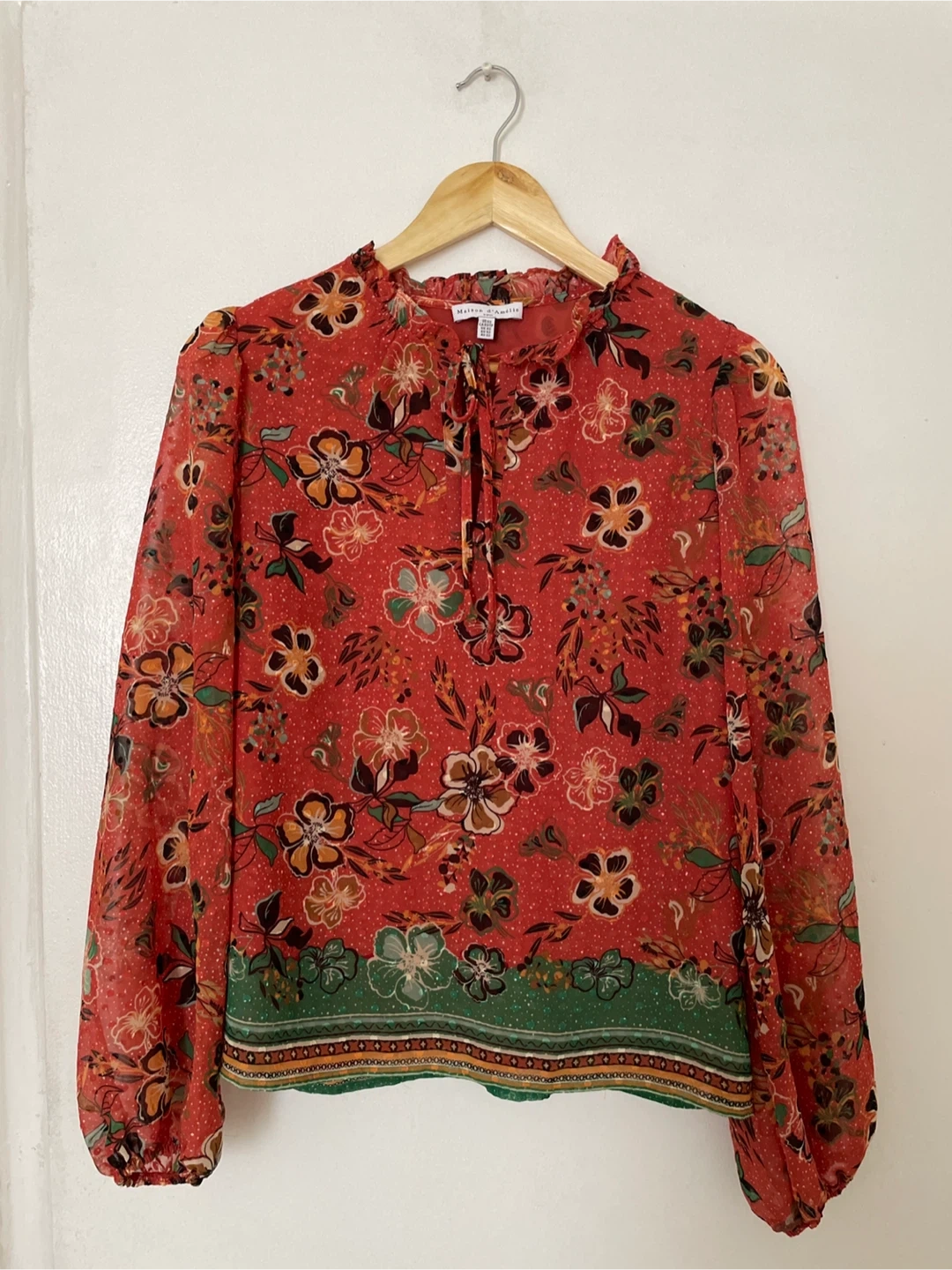 This Maison d'Amélie long-sleeve blouse features a vibrant all-over floral print on a red background. It has a ruffled mock neck with a tie closure and a decorative green border at the hem. Sheer fabric with a slightly textured pattern. Size XS. Brand New never worn.