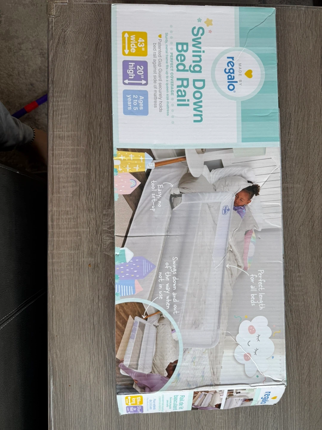 Handy Regalo swing down bed rail. This white bed rail is 43 inches wide and 20 inches high. Good for kids ages 2 to 5 years. Easy no tool set-up. Swings down and out of the way when not in use. Perfect length for all beds.