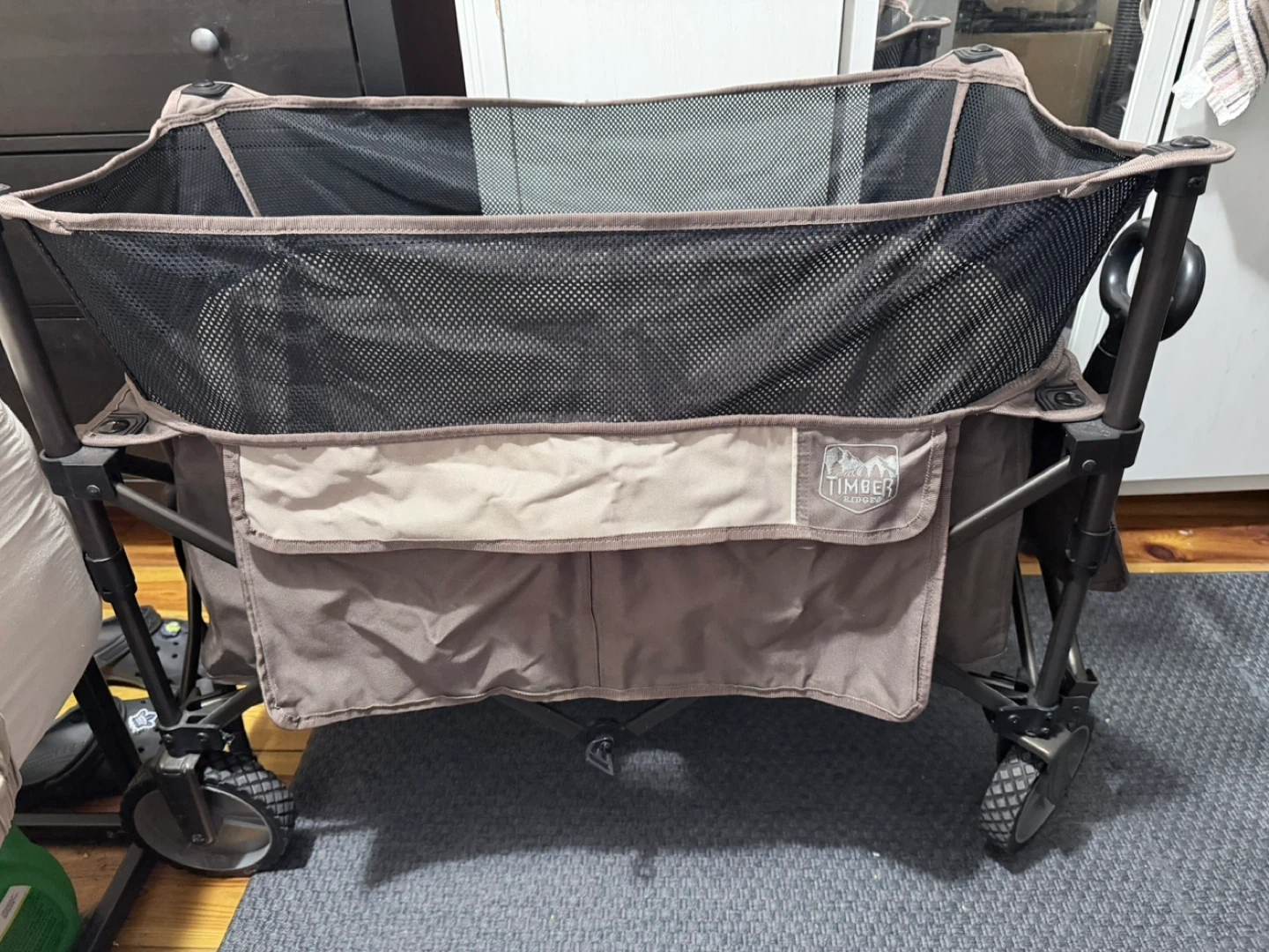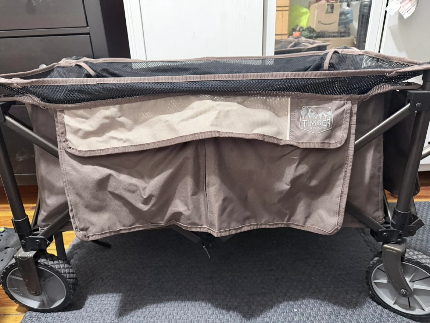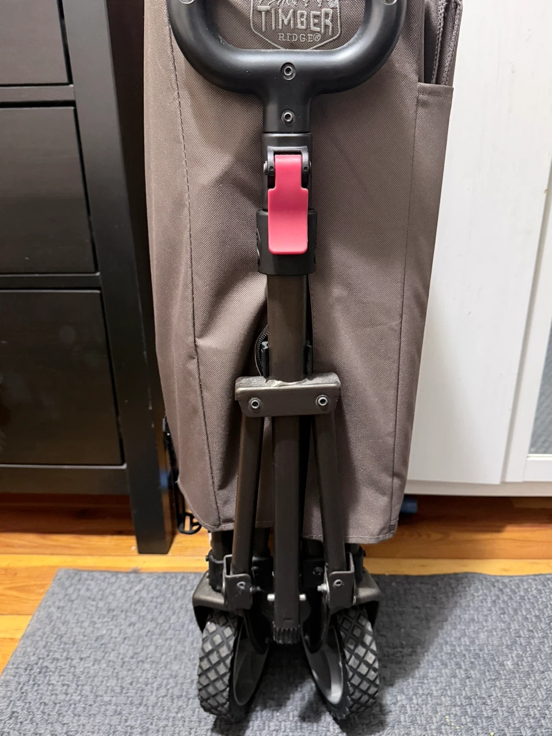 This Timber Ridge folding wagon is designed for easy transport. It features a durable fabric construction and sturdy wheels. It folds flat for convenient storage.