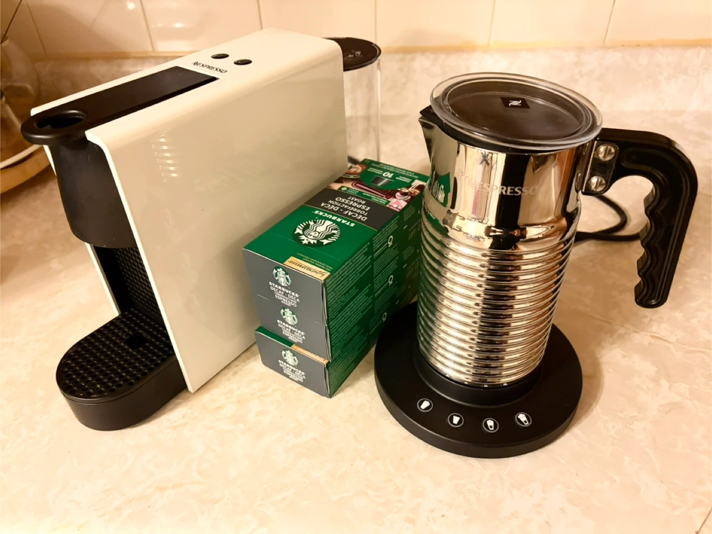 Nesspresso machine + milk frother + espresso pods