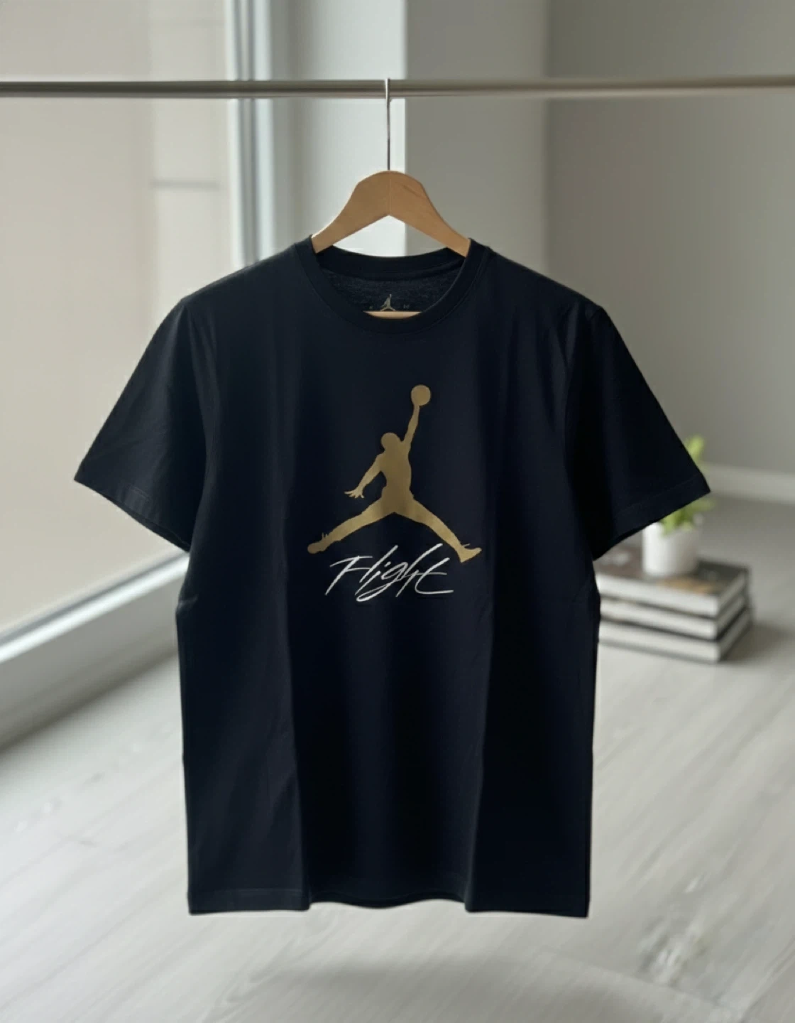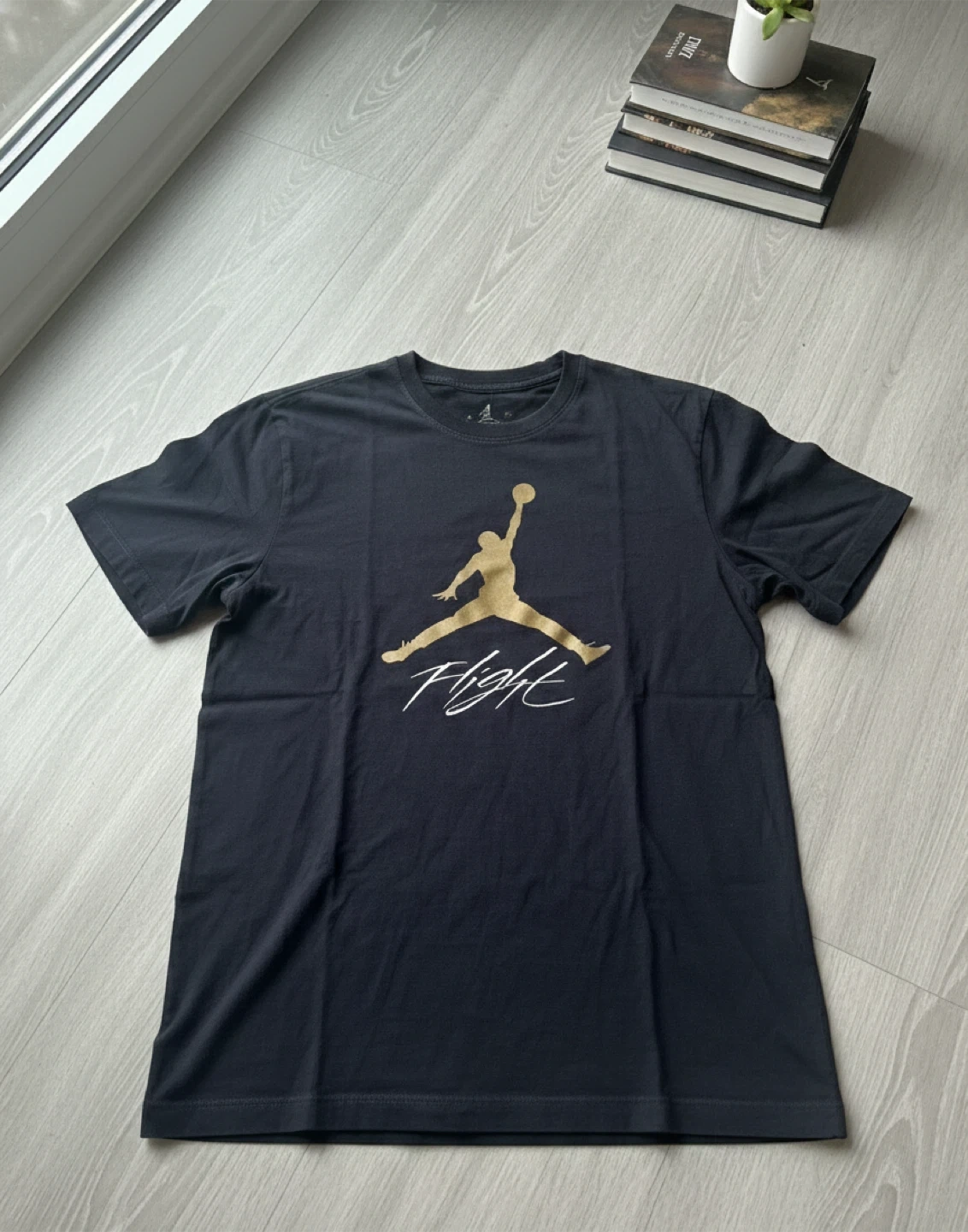 This is a black short-sleeve t-shirt from Jordan featuring the iconic Jumpman logo and "Flight" script in gold. It's made of a soft cotton blend for comfort.