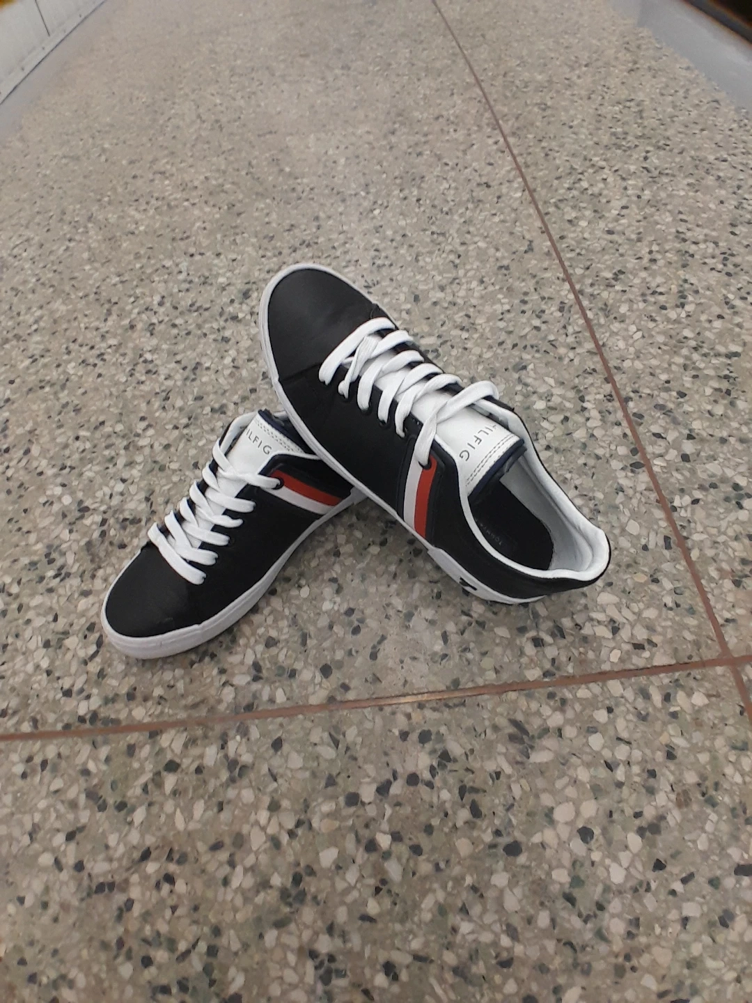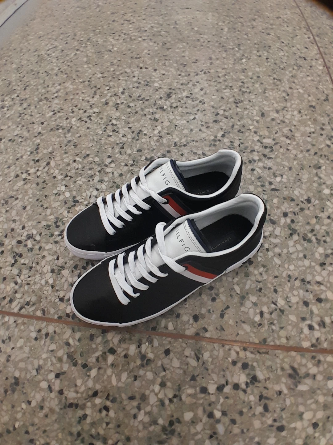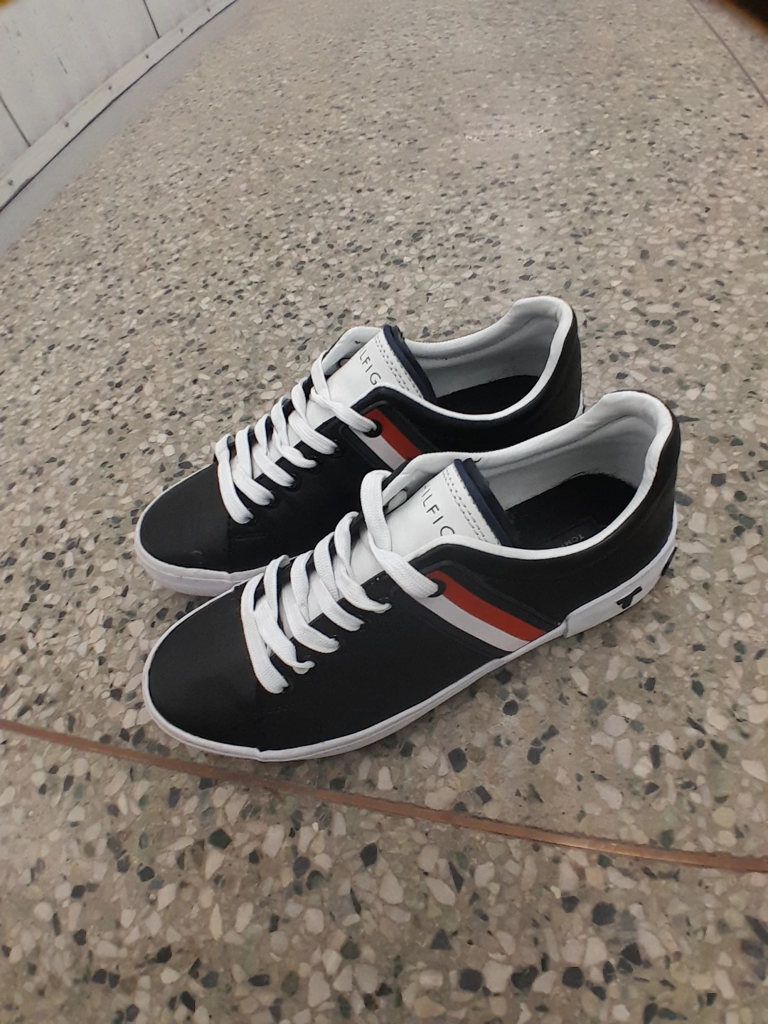 Tommy Hilfiger sneakers with white laces and signature red and blue stripe detail. They have a comfortable low-top design and a durable rubber sole. These sneakers are great for everyday wear and casual outings! Men's size 7