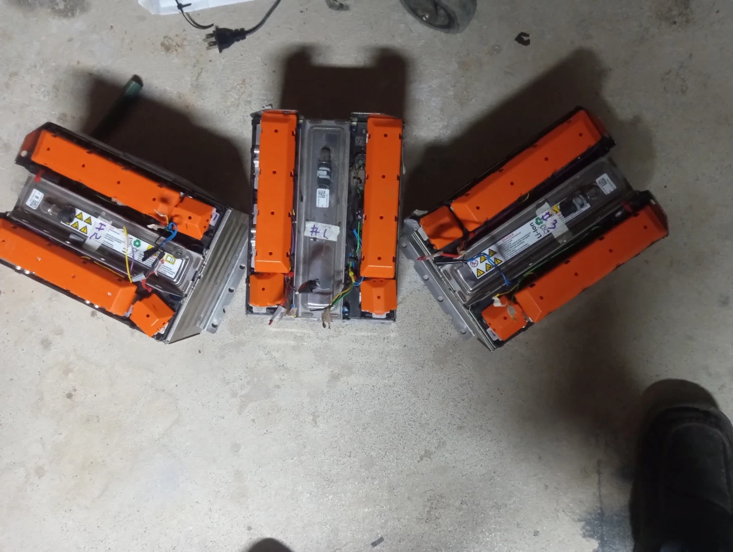 Three electric vehicle battery modules. These units are designed for high-performance applications. They feature robust construction and advanced battery technology.