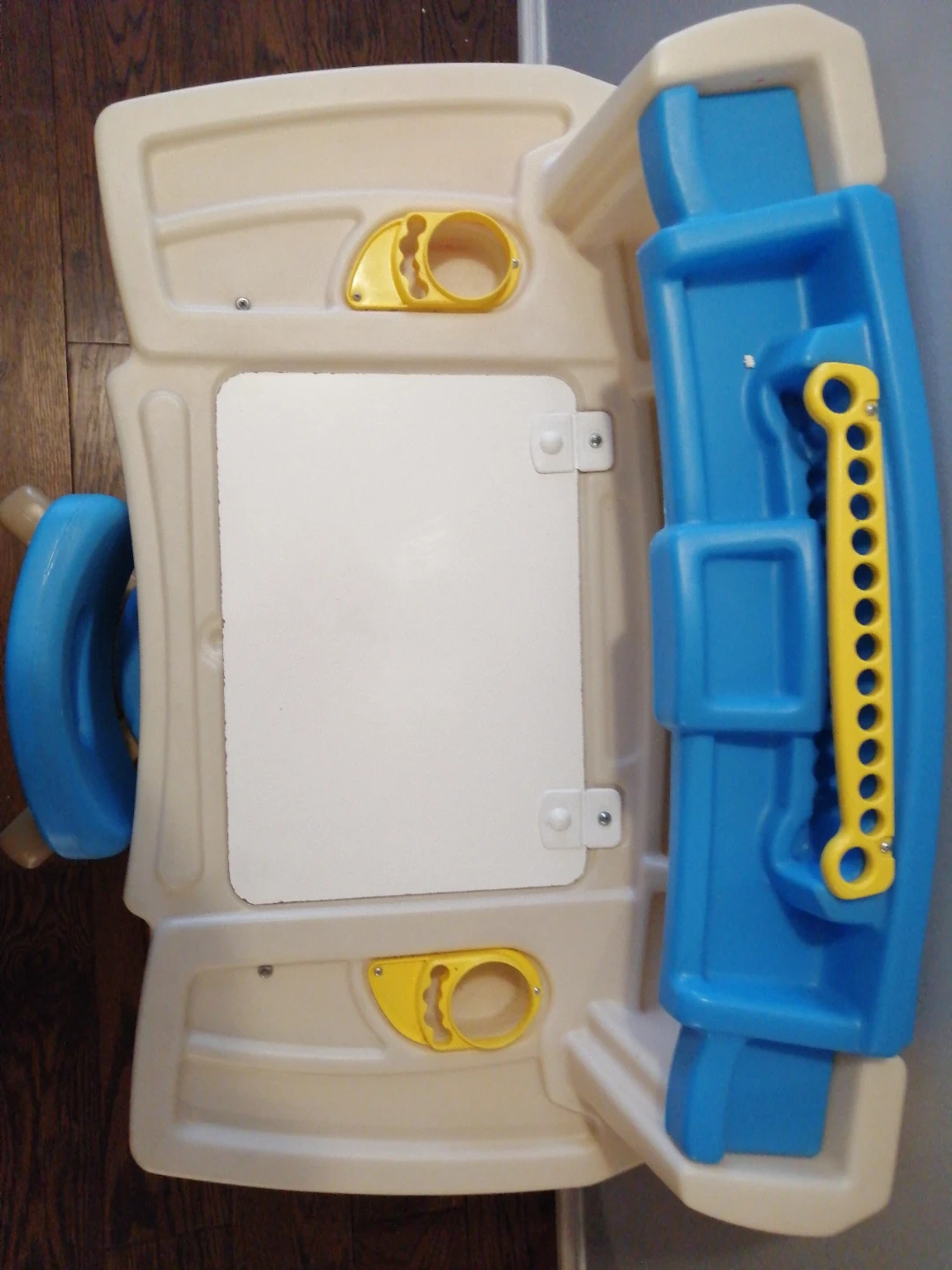 This Step2 art desk and chair set is perfect for creative play. It's made of durable plastic with a blue and tan colour scheme. The desk has a spacious work surface for drawing and crafting.