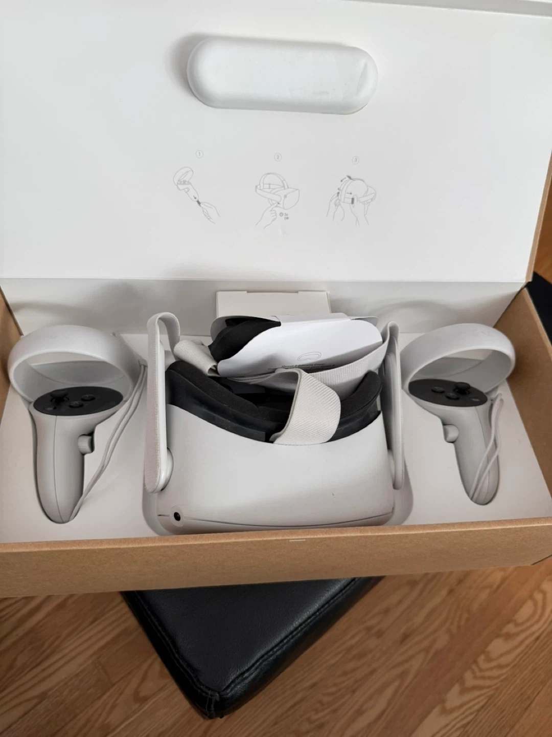 Meta Quest 2 virtual reality headset with 128 GB storage. It comes with two controllers and is in its original box. This headset offers an immersive gaming and entertainment experience.