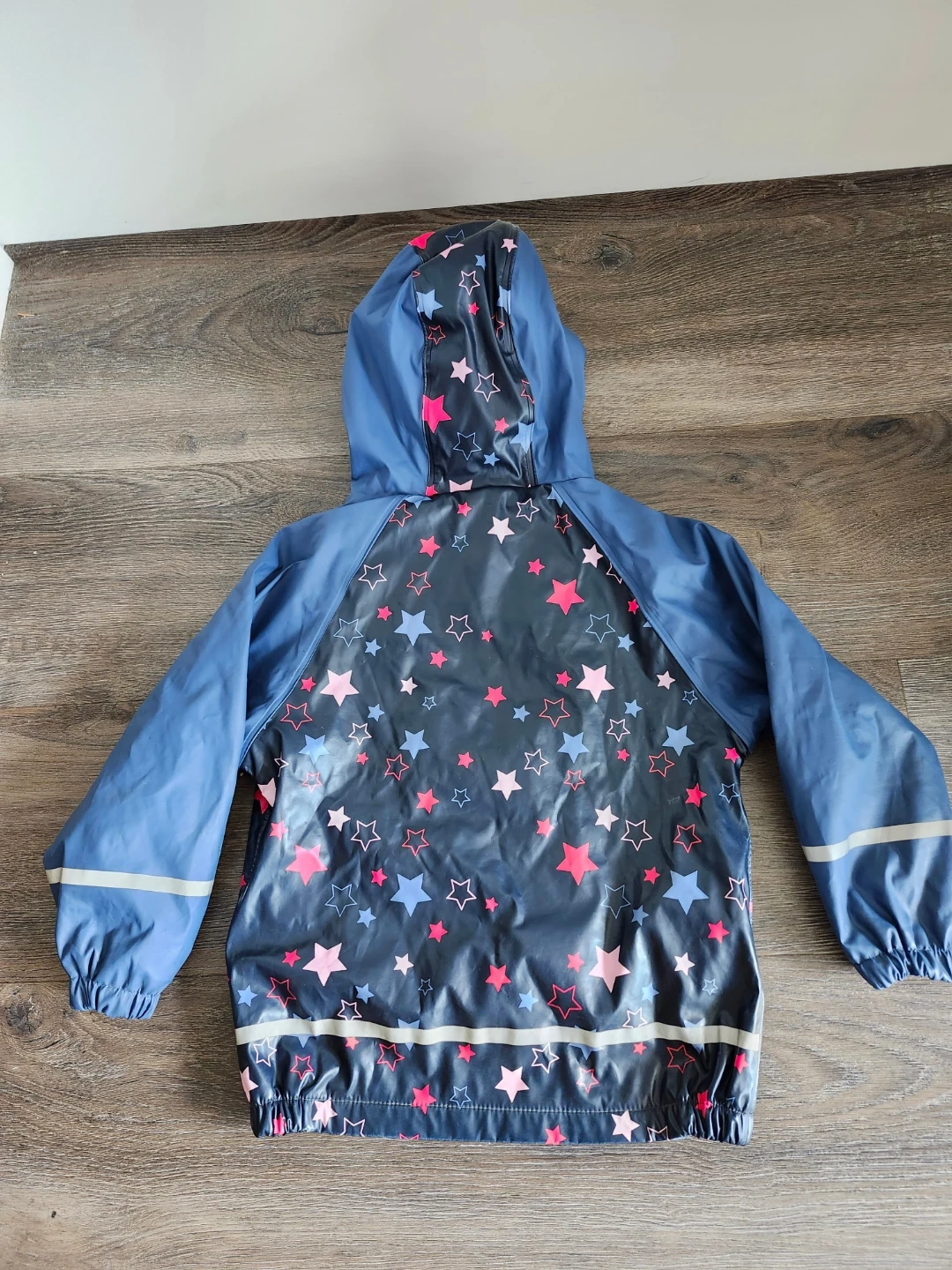This Lupilu rain jacket is designed for little ones. It's blue with a fun star pattern and has reflective stripes on the sleeves and hem. The jacket is lined with fleece for extra warmth. It's great for keeping dry on rainy days!