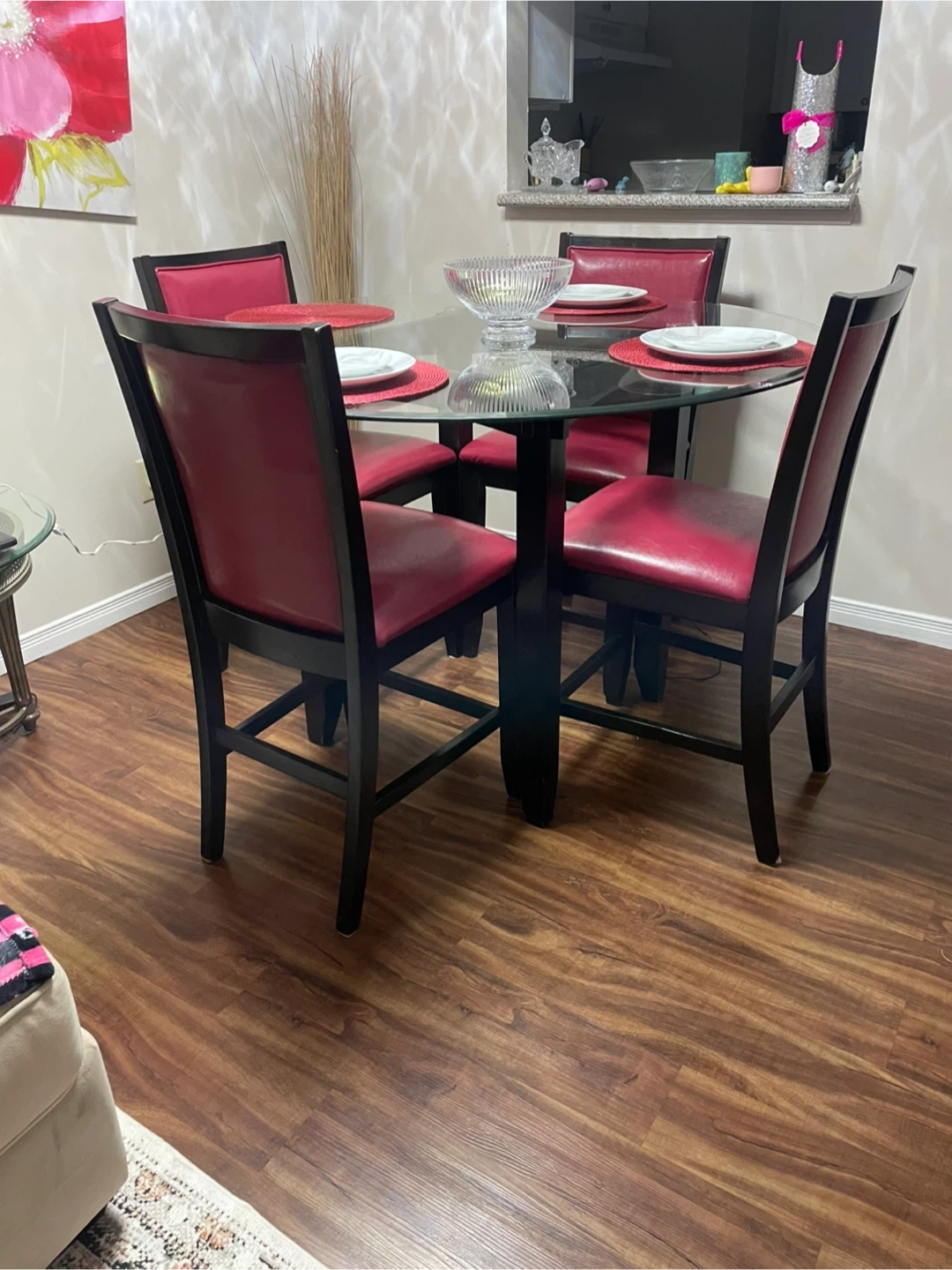 A round glass-top dining table with four dark wood chairs featuring red upholstery. It's a compact set perfect for smaller dining areas. The chairs have a sleek, modern design.