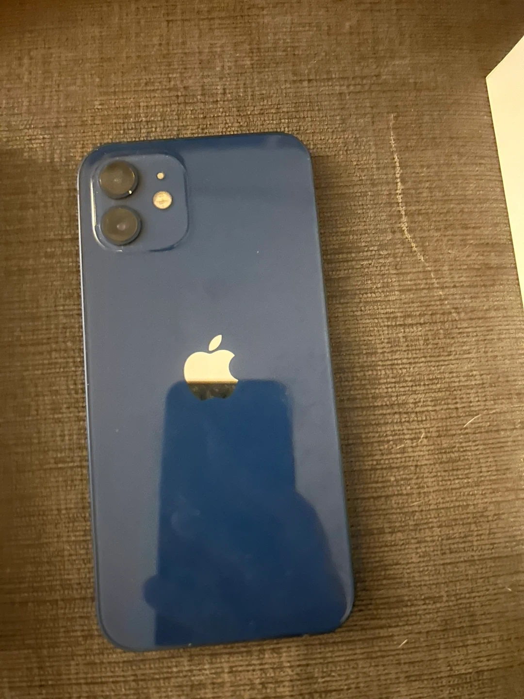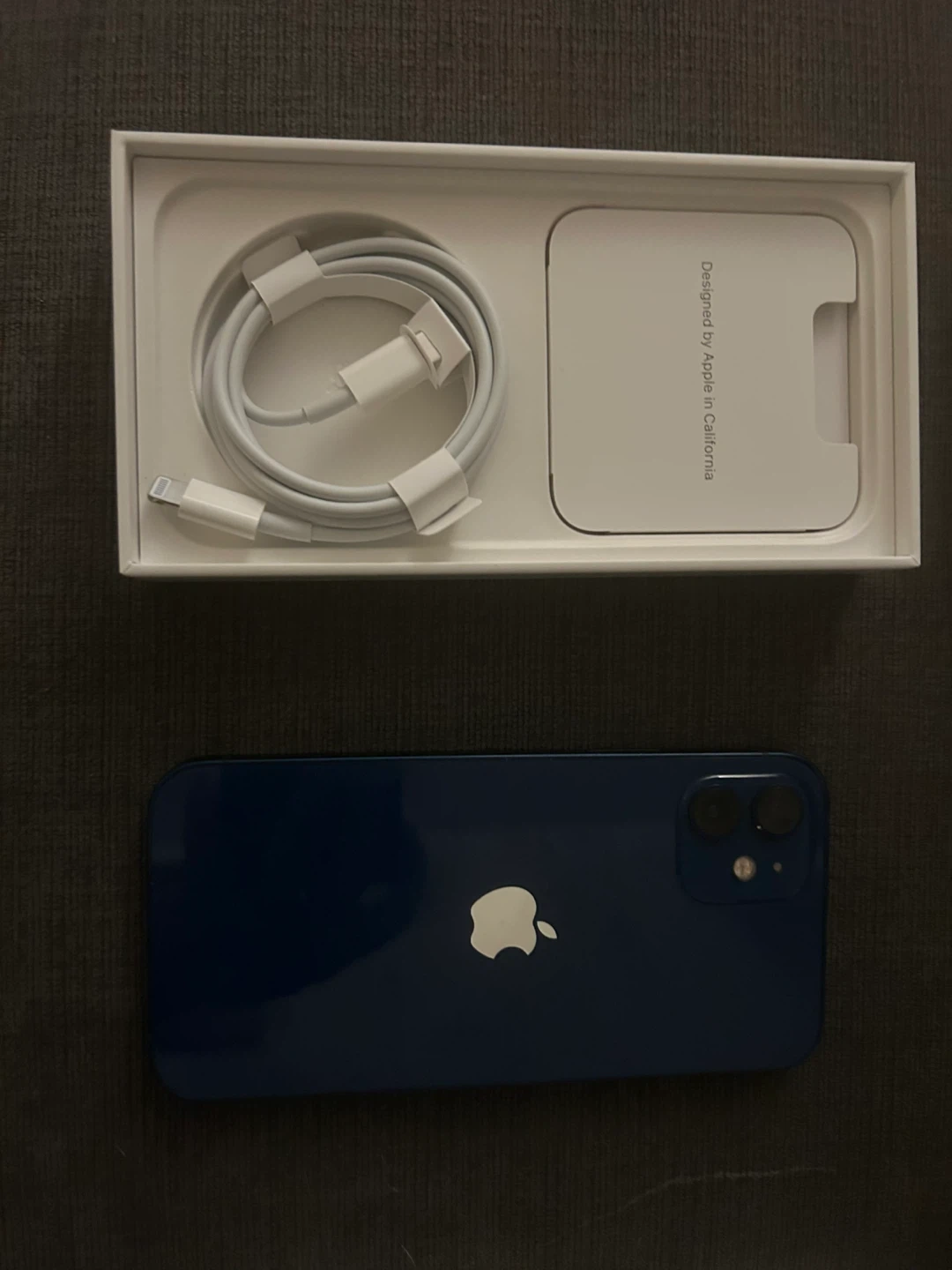 Apple iPhone 12 with 128 GB storage in blue. It's the 128 GB model and comes with original box and charging cable.