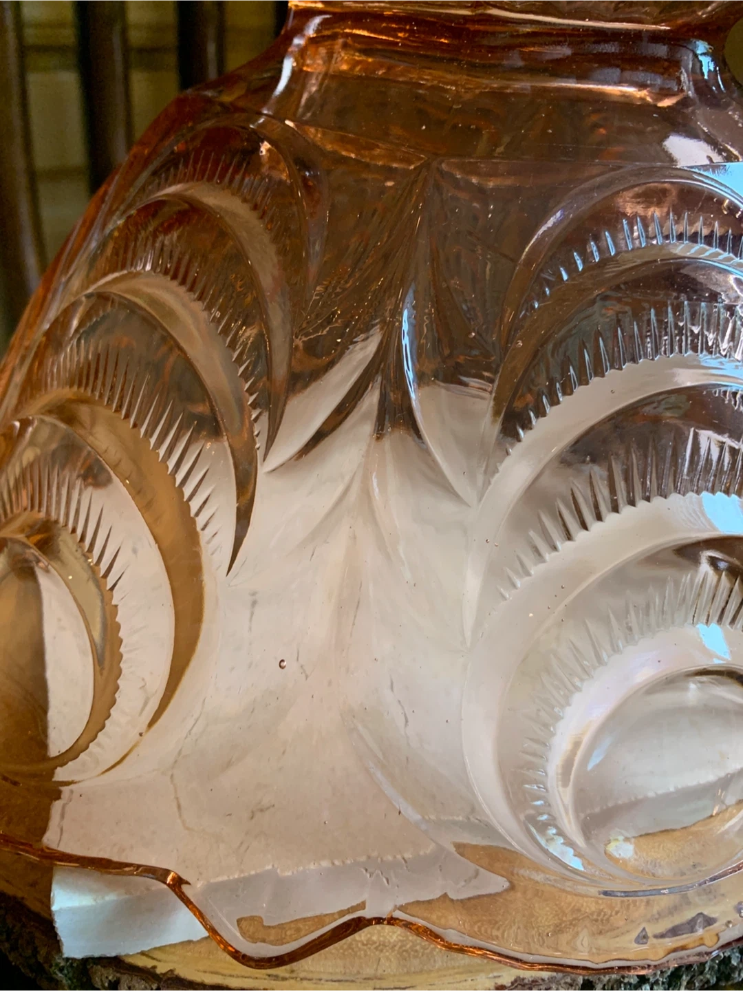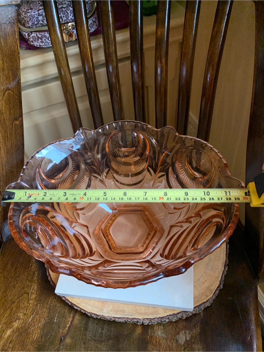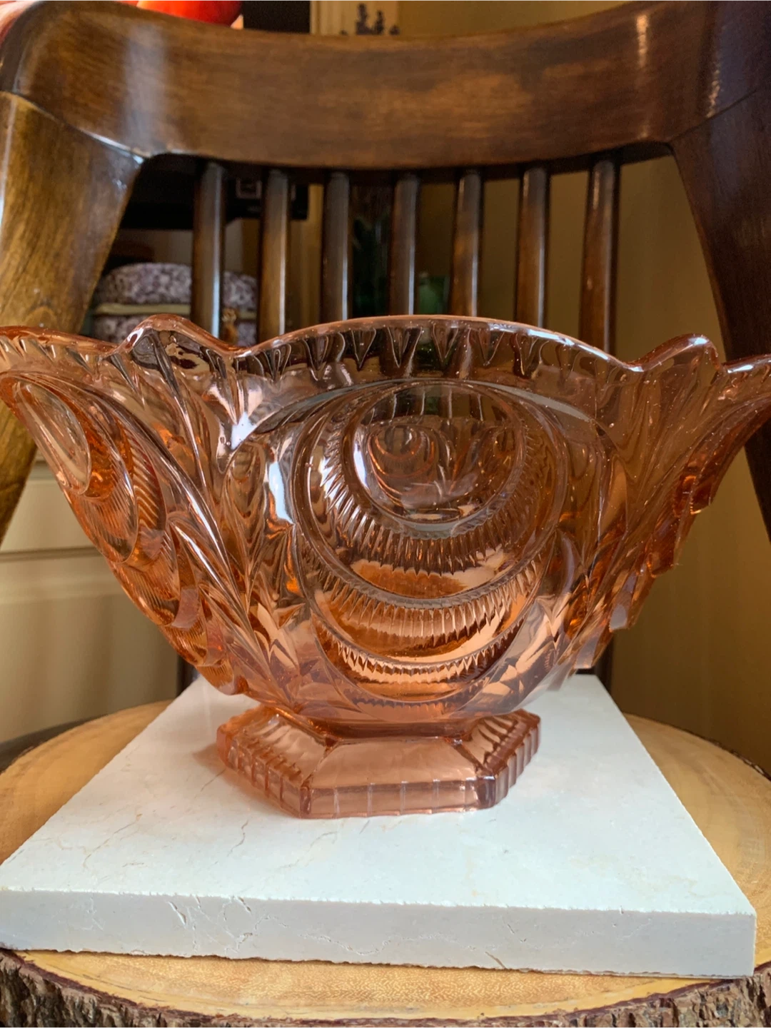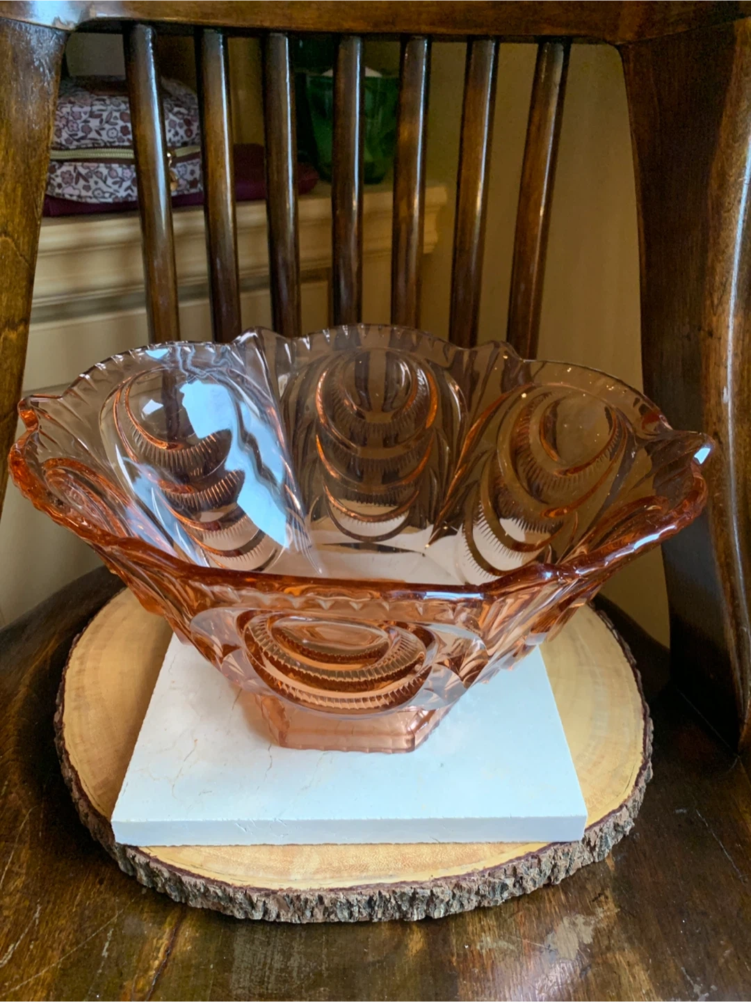 This is a a really special vintage 1930’s pretty pink depression glass serving bowl with intricate carved details. The pink glass may have been called Rosaline pink and it is pressed into these beautiful shapes. It most likely was produced in Belgium or Germany. It is very heavy and substantial with only one disclaimer of a manufacturing error and a small flea bite as seen in pics. It would make for a stunning centrepiece for any table or kitchen island. Originally used as a fruit bowl, but could really have a variety of uses. The diameter measures 11” and it is about 6” tall. This Art Deco stunner needs to shine in someone’s home!
