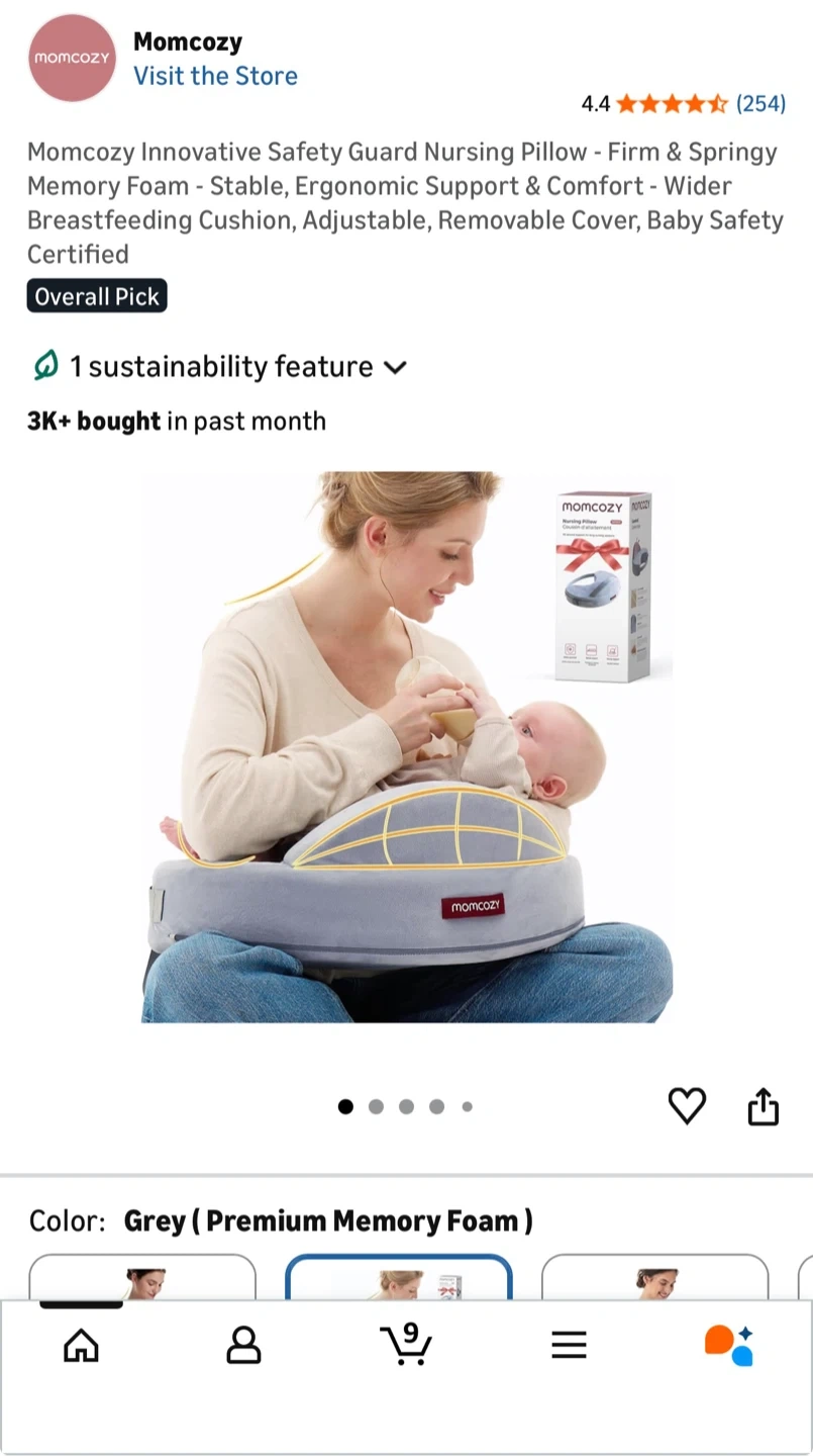 This Momcozy nursing pillow is made with premium memory foam. It features an adjustable strap and a removable cover for easy cleaning. Designed for comfortable breastfeeding support.