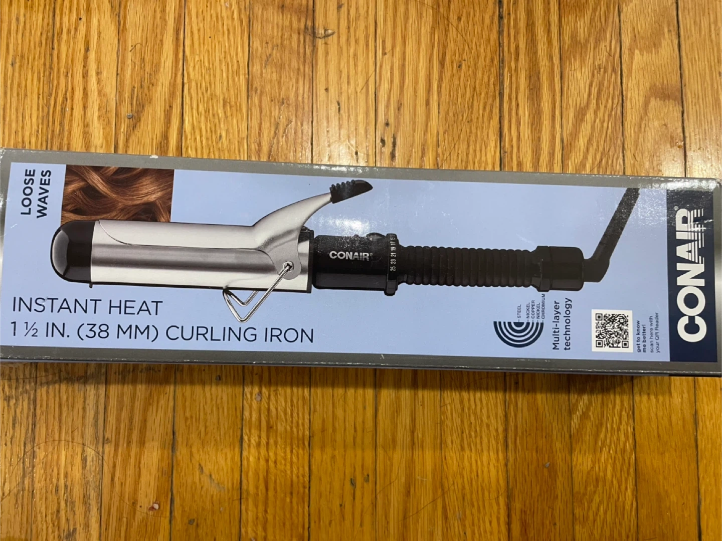 This Conair curling iron features instant heat for quick styling. It's a 1 1/2 inch (38 mm) barrel size. Multilayer technology provides even heat distribution.