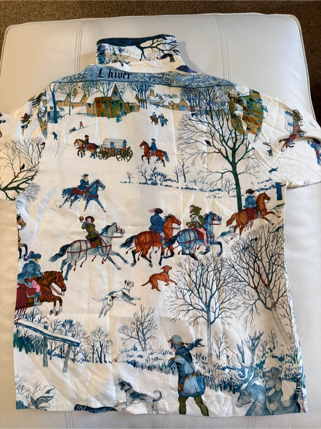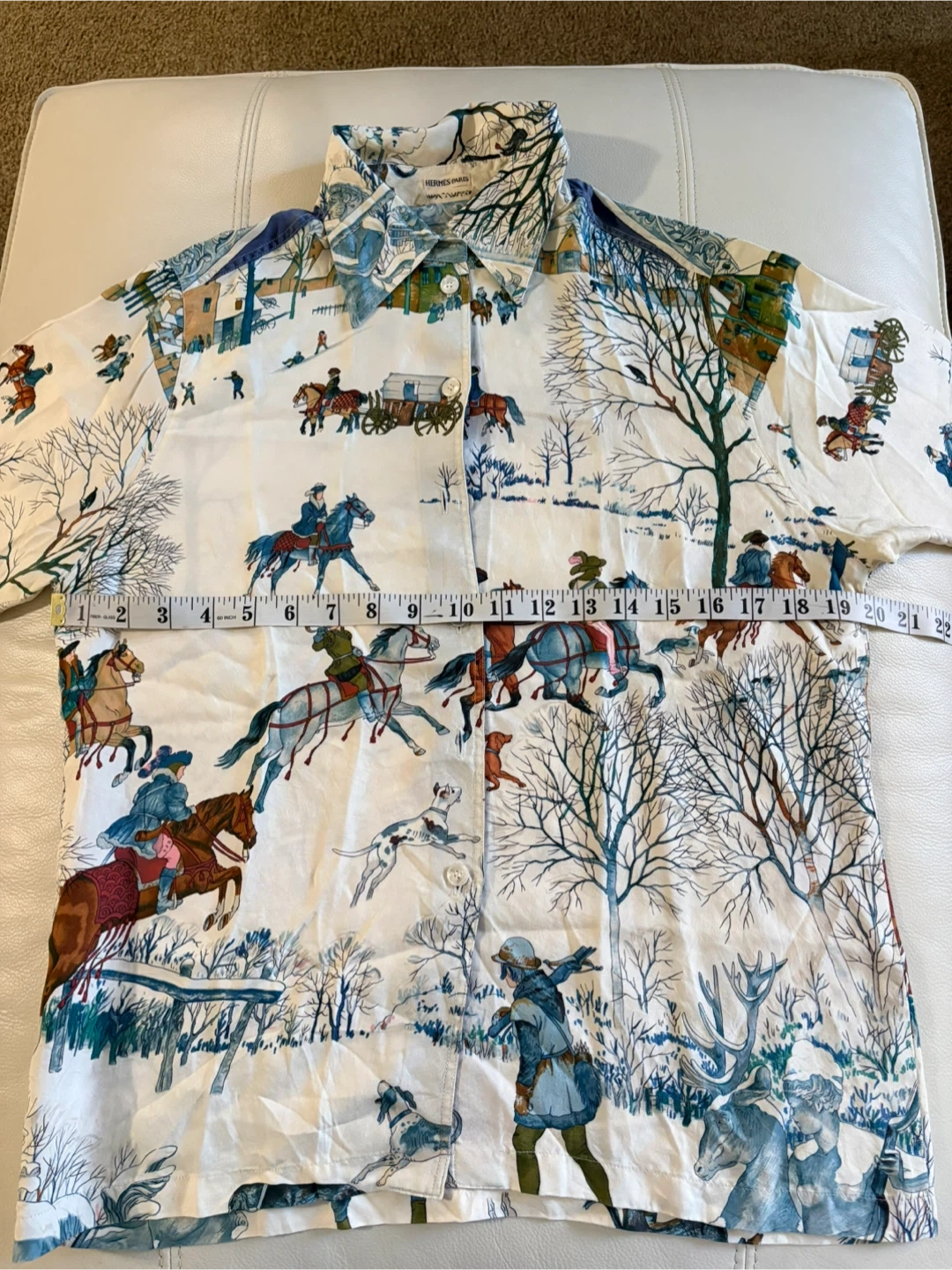 Vintage. Here's a stylish Hermès Paris button-up shirt! The shirt features a unique pattern with a winter scene. It's in great condition and ready to wear